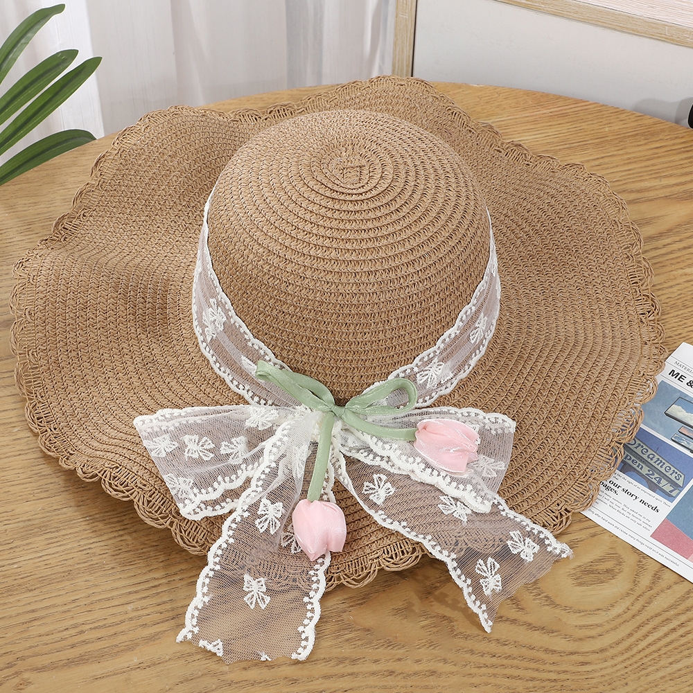 • 물결 튤립 망사 리본 밀짚모자 - 커피색