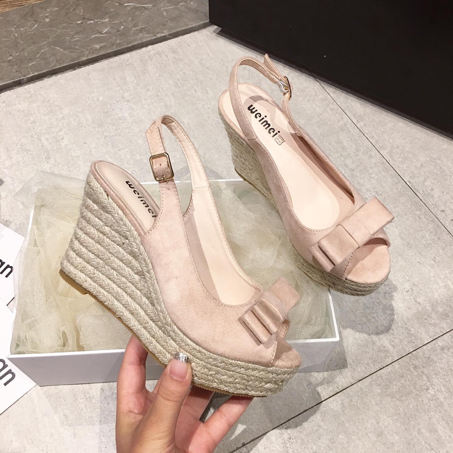 2022 여름 새로운 달콤한 활 짠 대마 로프 두꺼운 바닥 플랫폼 여성을위한 하이힐 물고기 입 웨지 샌들