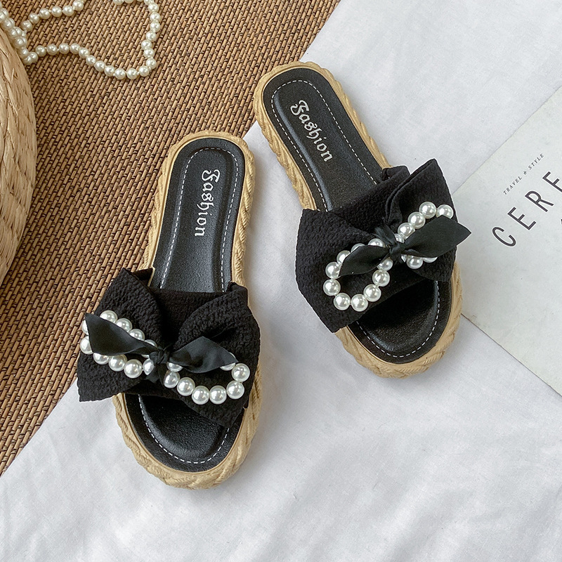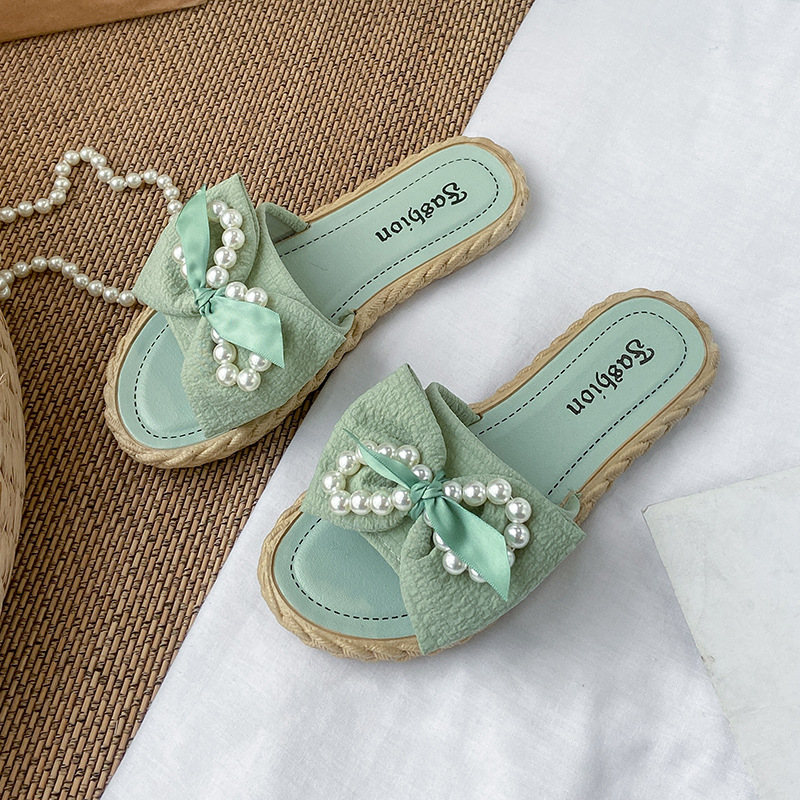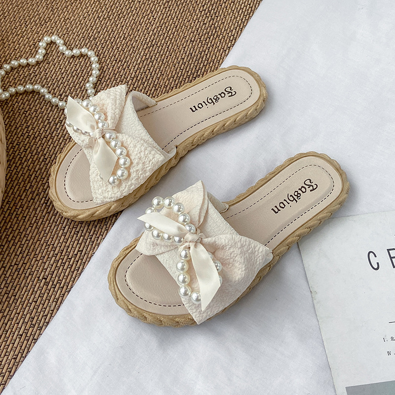 새로운 슬리퍼 여성용 여름 한국 스타일 아우터 펄 보우 플라워 비치 슈즈 샌들 여성용 플랫 슬리퍼