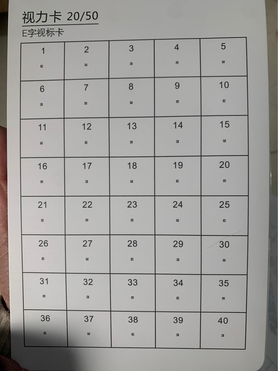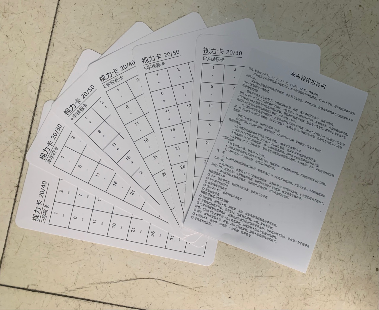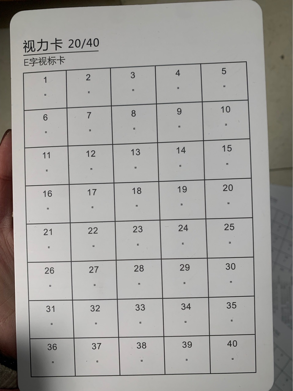 • 양면: 한쪽 20/30 E 문자/한쪽 20/40 E 문자