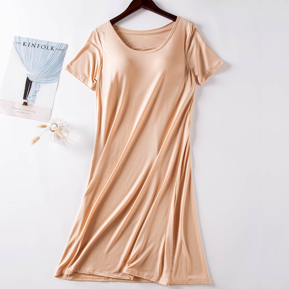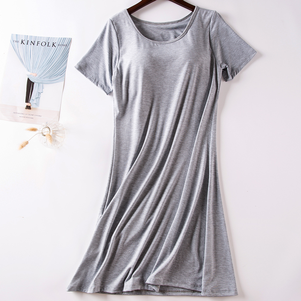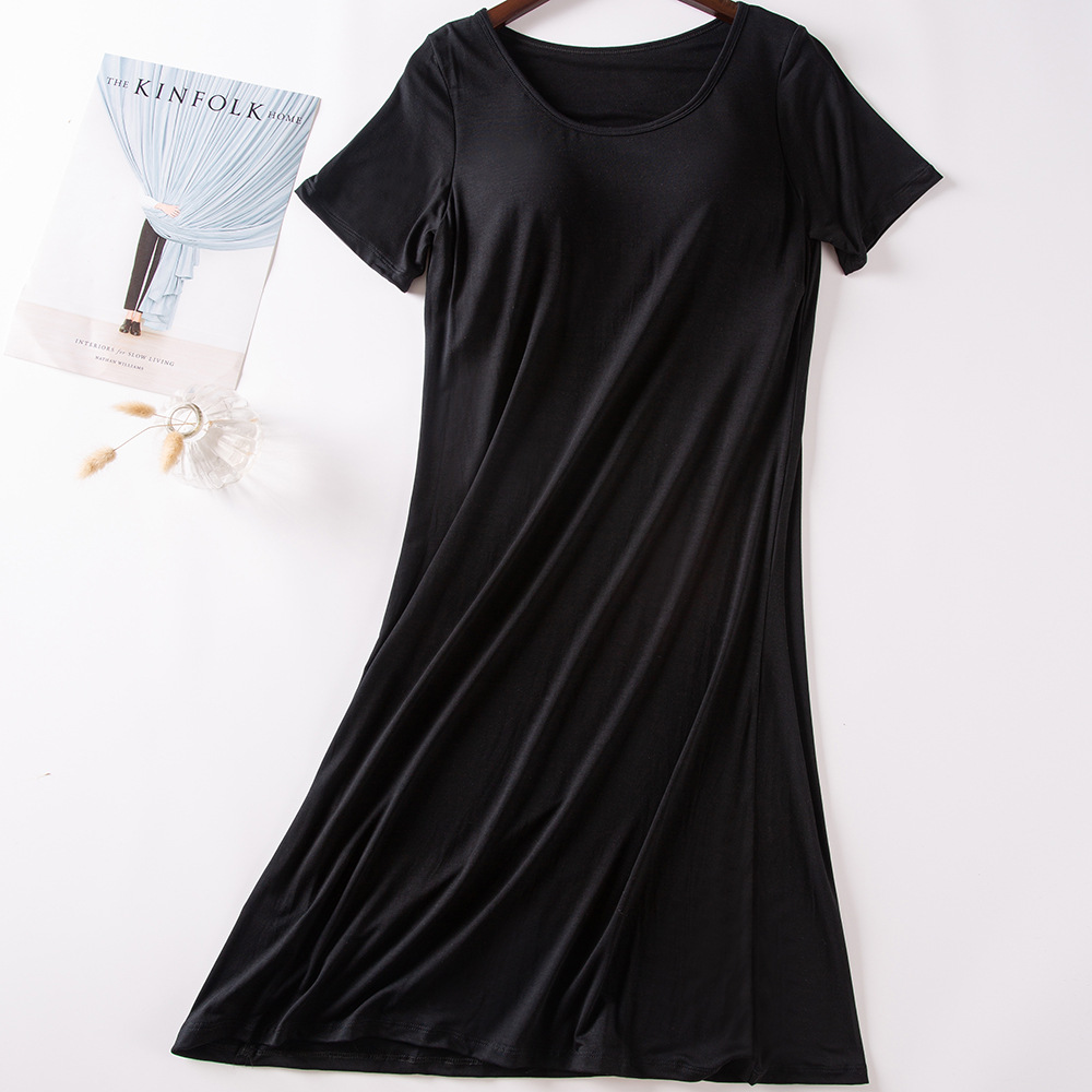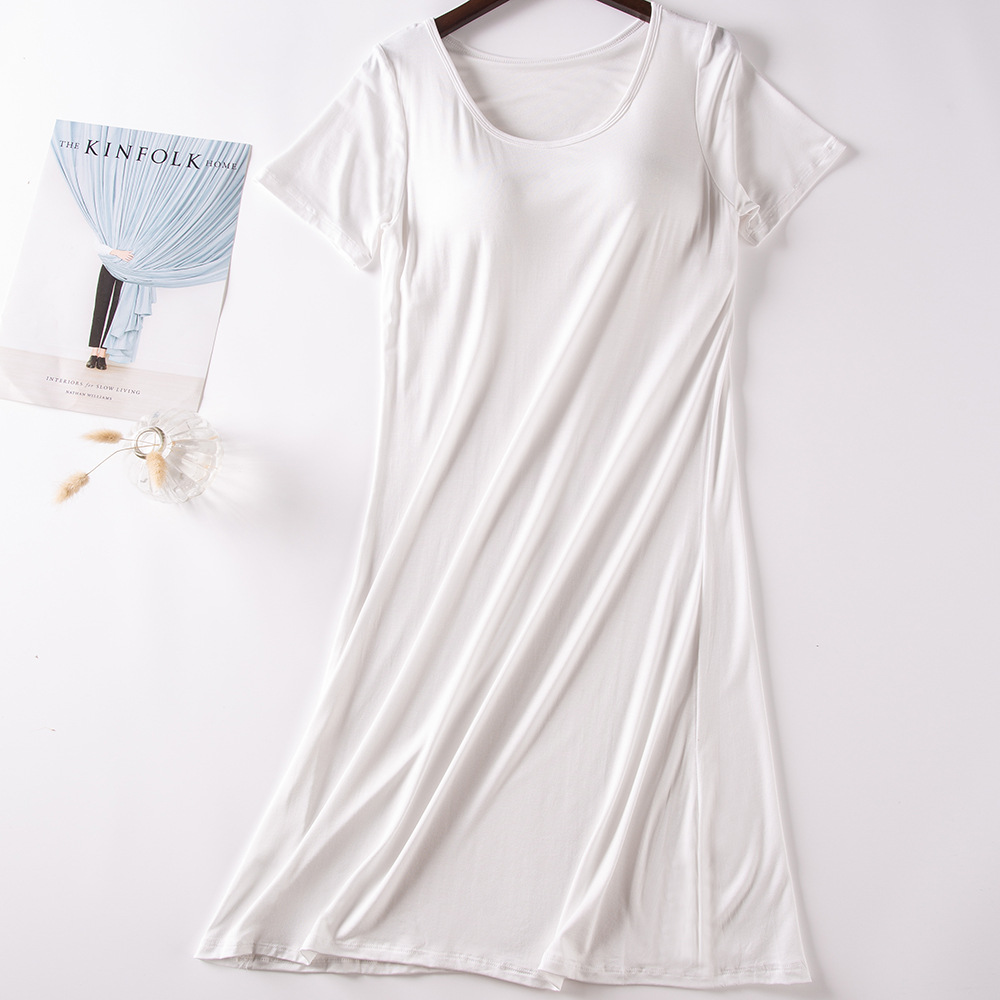 모달 반팔 잠옷 (가슴 패드 포함) 여성용 원피스 노 브라 플러스 사이즈 얇은 반팔 홈웨어 중간 길이 여름스토어 가기