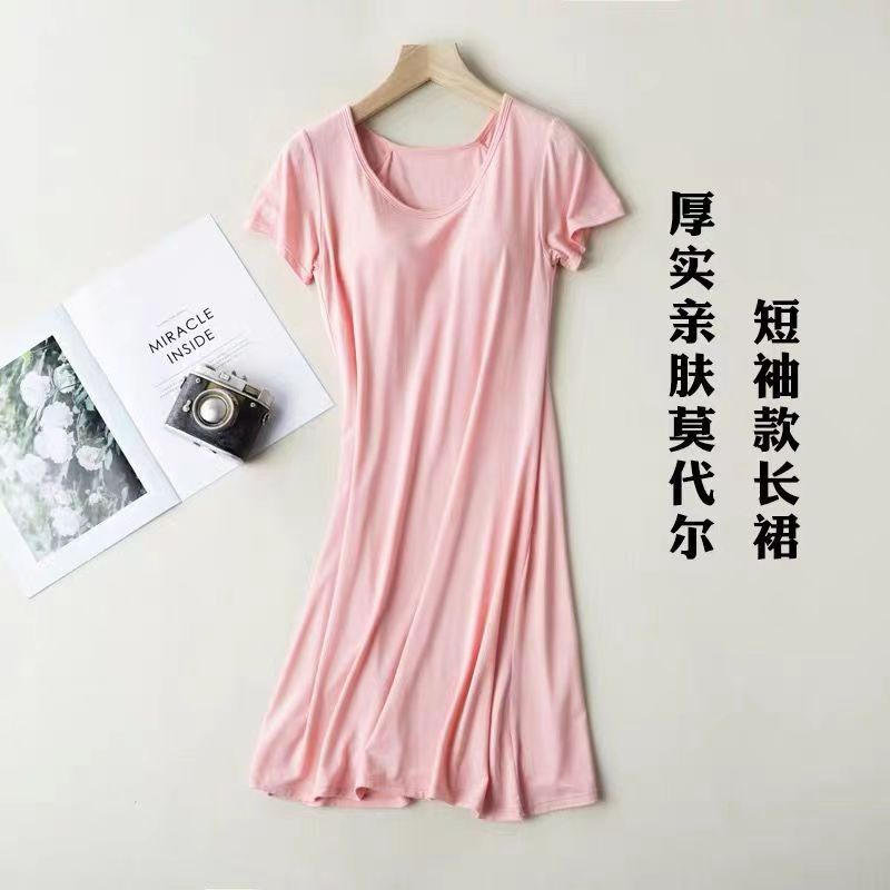 모달 반팔 잠옷 (가슴 패드 포함) 여성용 원피스 노 브라 플러스 사이즈 얇은 반팔 홈웨어 중간 길이 여름
