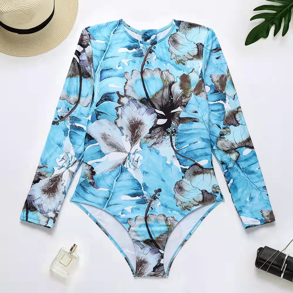 2025 유럽 및 미국 프린트 원피스 수영복 여성용 크로스보더 스포츠 긴팔 타이트 슬림 수영복 서핑 유럽 및 미국 패션