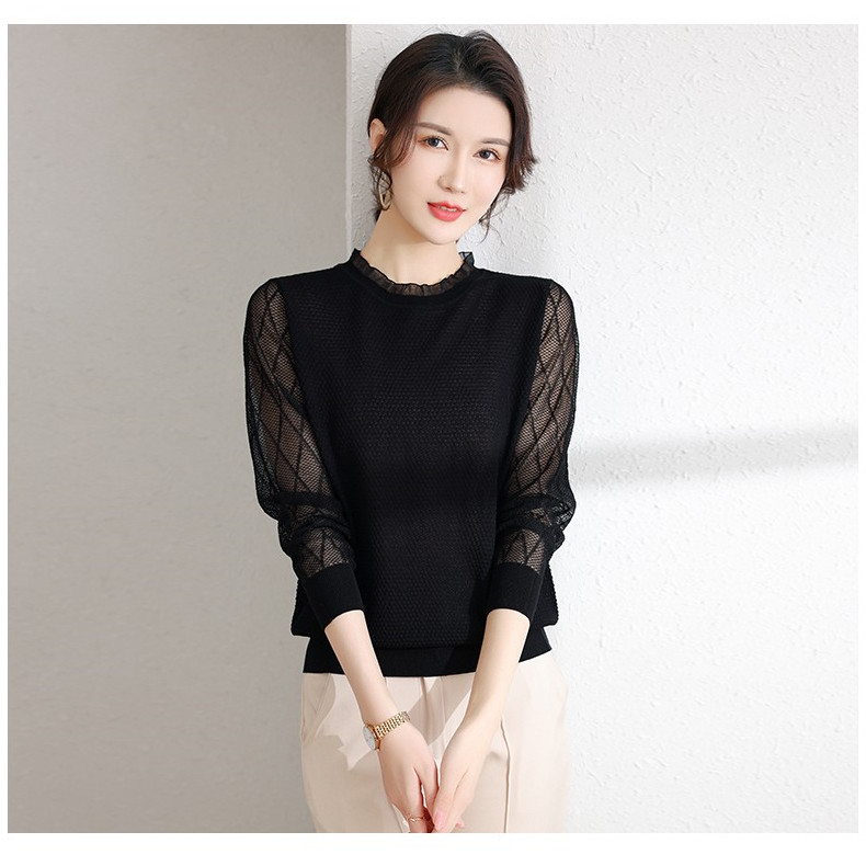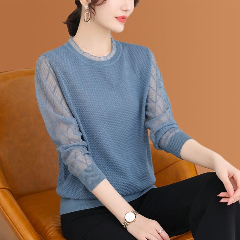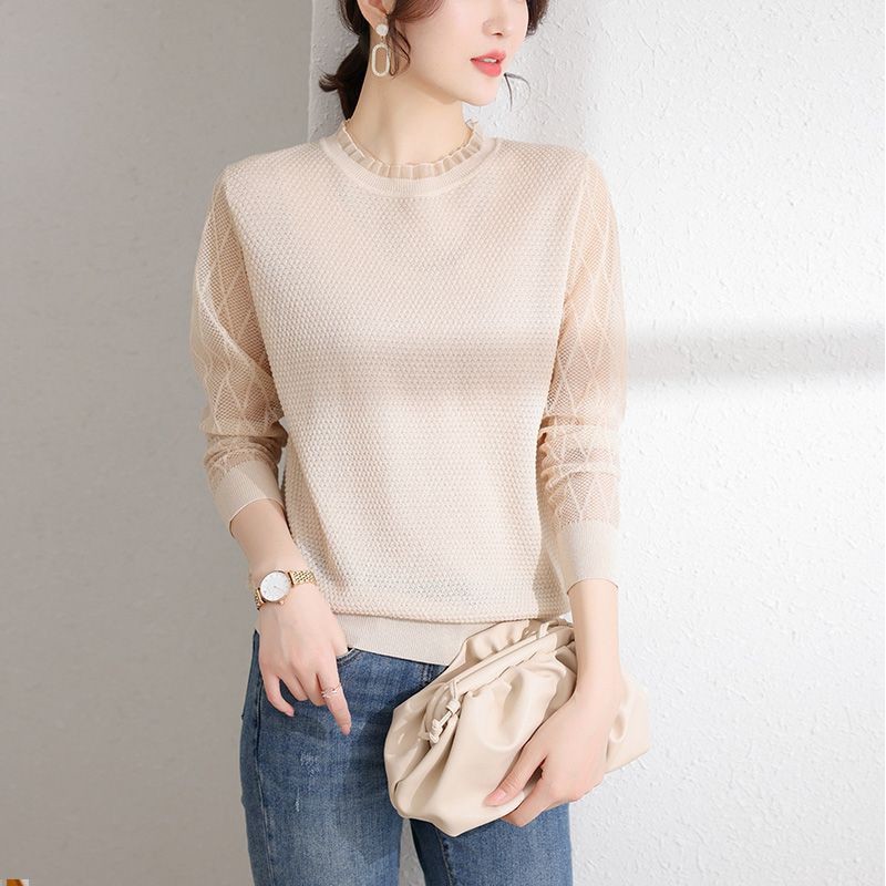 긴팔 티셔츠 여성용 봄 옷 2023 새로운 스타일 레이스베이스 셔츠 여성용 봄과 가을 아이스 실크 니트 탑 트렌디