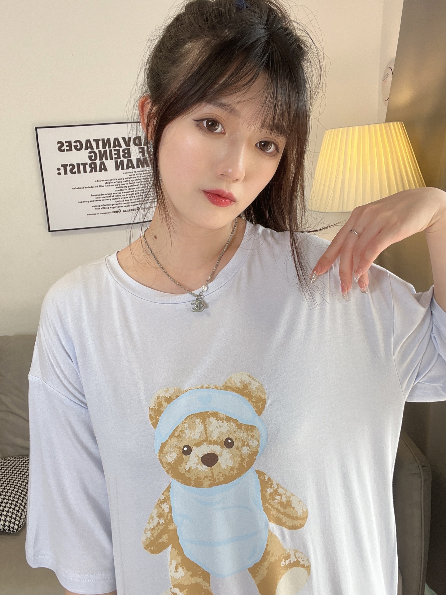 Reefur Rinka 배 꽃 홈 여름 얇은 청소년 여성 잠옷 반팔 라운드 넥 인쇄 만화 곰 잠옷스토어 가기
