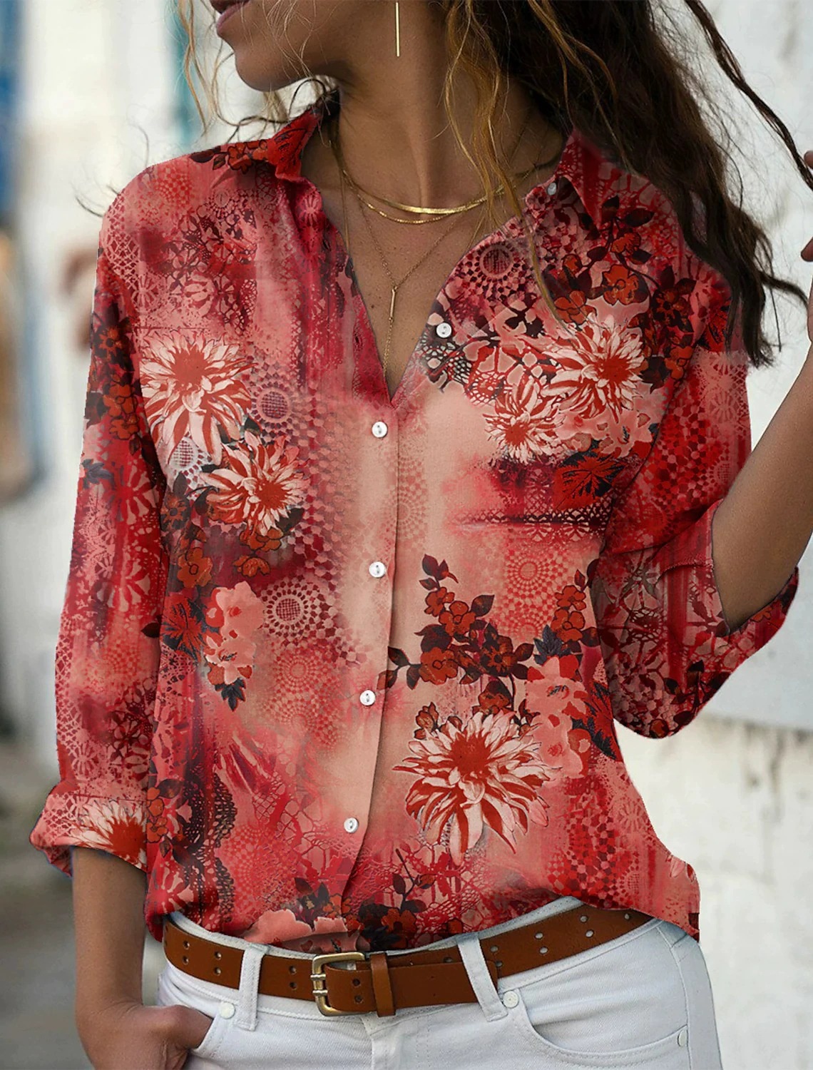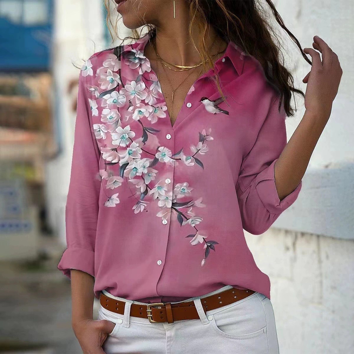 大量现货2023欧美春夏季新款外贸wish亚马逊花朵印花长袖翻领衬衫