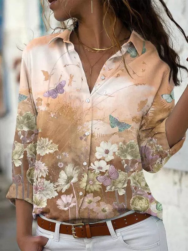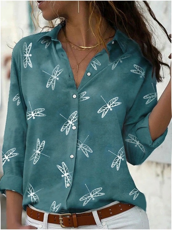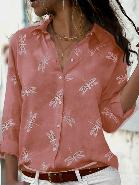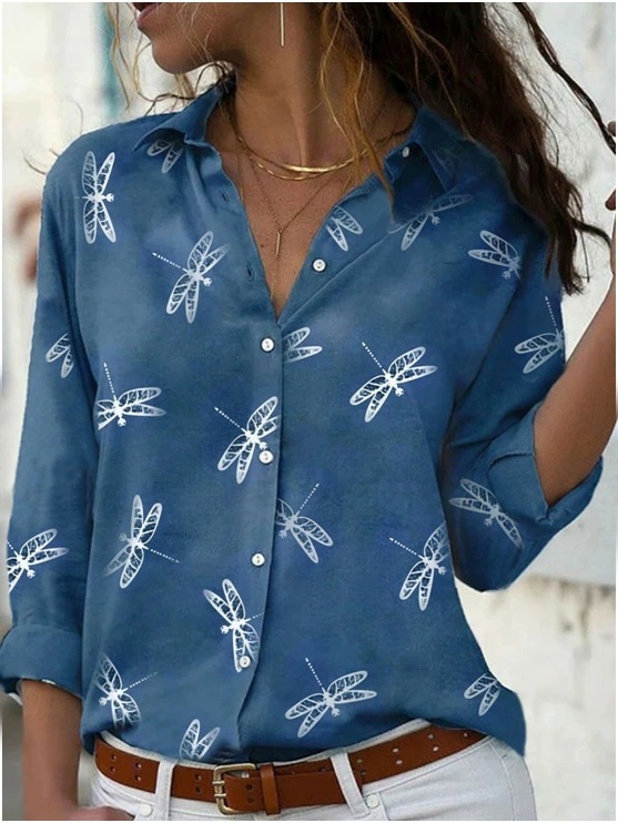 当天发货 2023跨境亚马逊速卖通蜻蜓印花长袖翻领修身时尚衬衫女