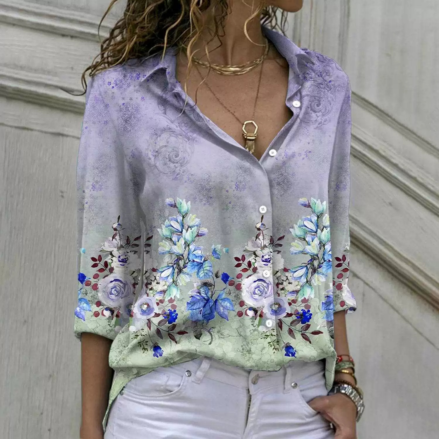 재고 유럽과 미국의 대외 무역 아마존 여자의 느슨한 옷깃 긴 소매 싱글 브레스트 셔츠 우아한 레이디 프린트 탑스토어 가기