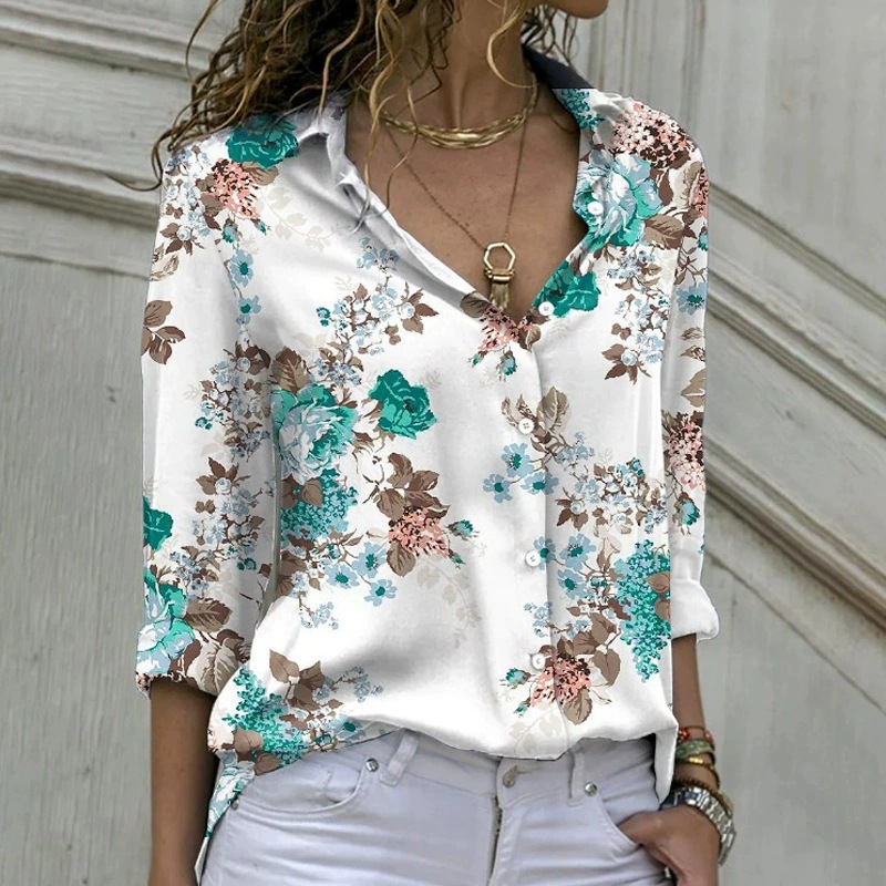 现货 2023新款外贸女装碎花印花衬衫亚马逊速卖通女士长袖V领衬衫
