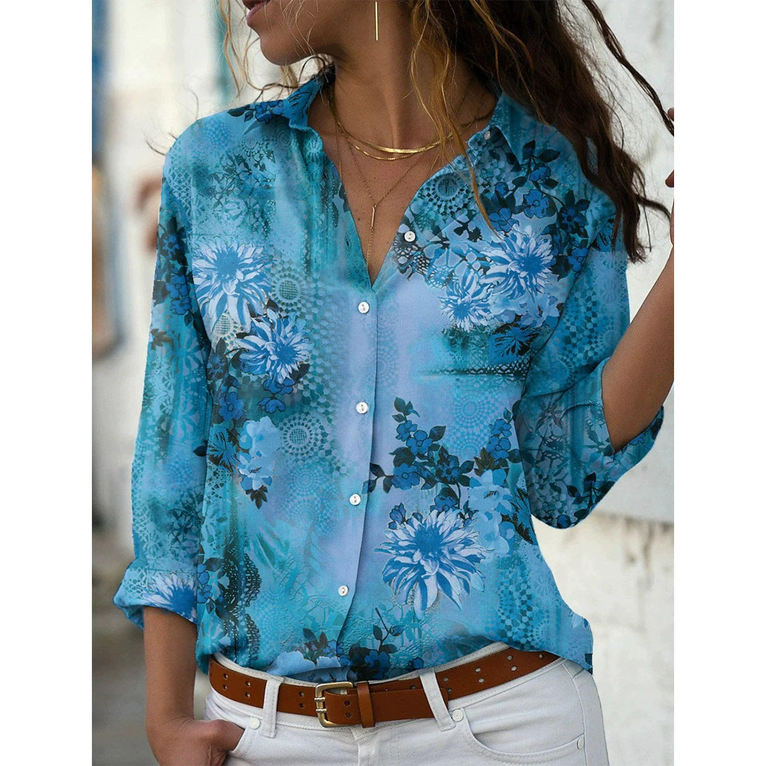 当天秒发 2023春夏欧美外贸女装衬衣新品速卖通印花长袖翻领衬衫