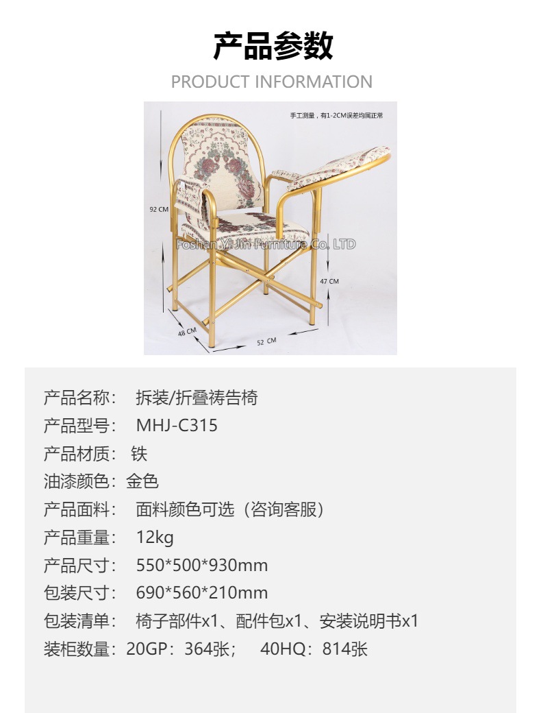 불산 무슬림 가구용품 금속 분리형 예배 의자 철제 다기능 접이식 팔걸이 기도 의자