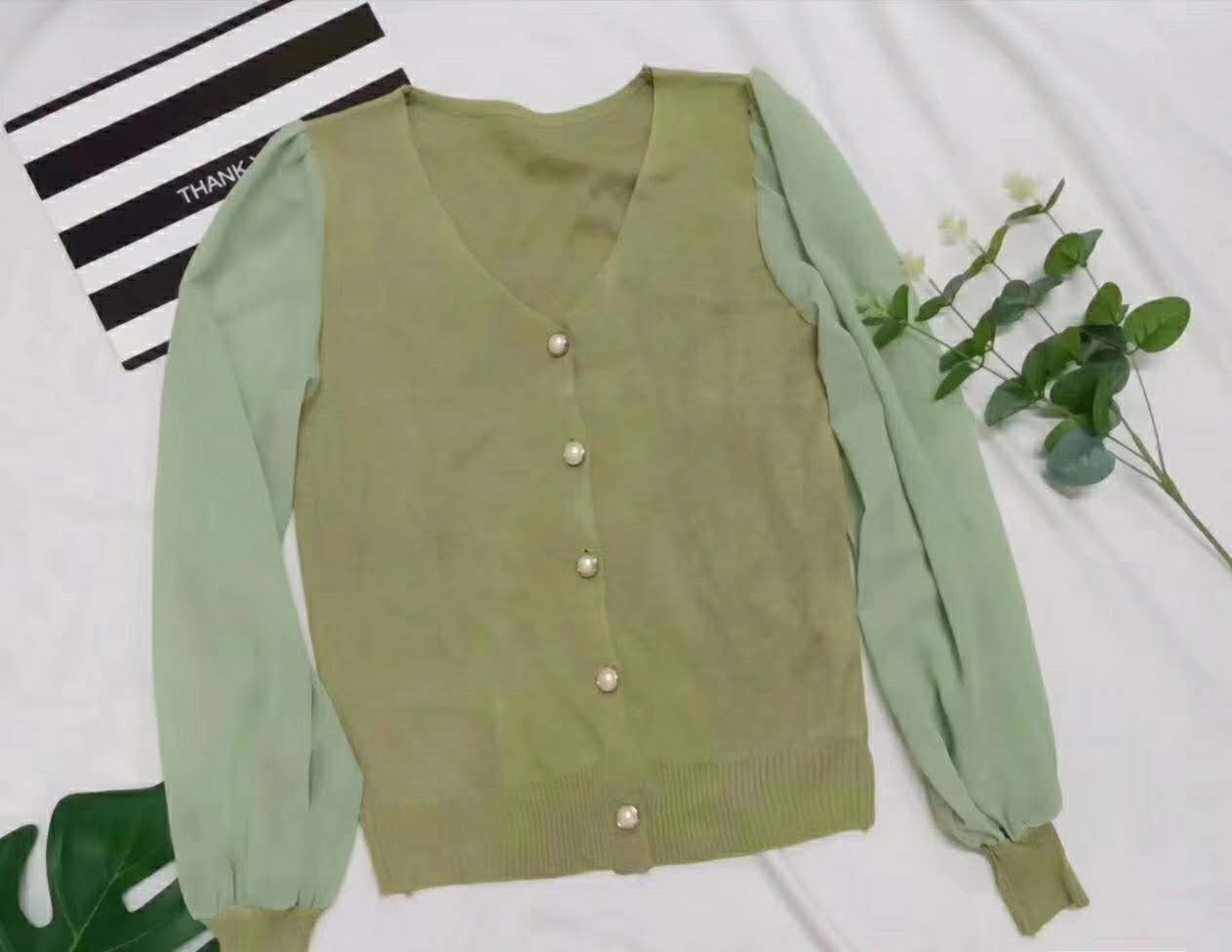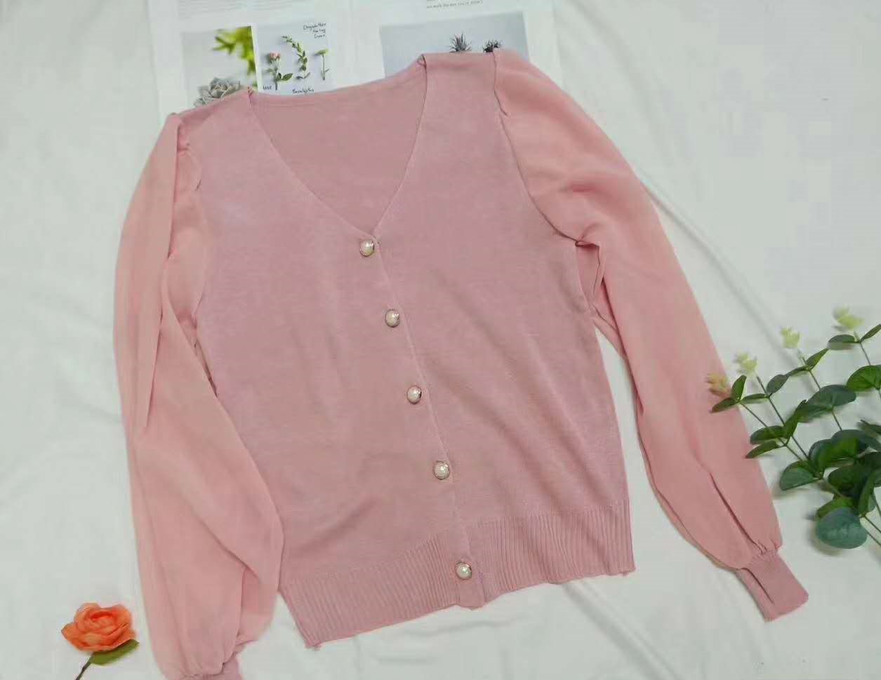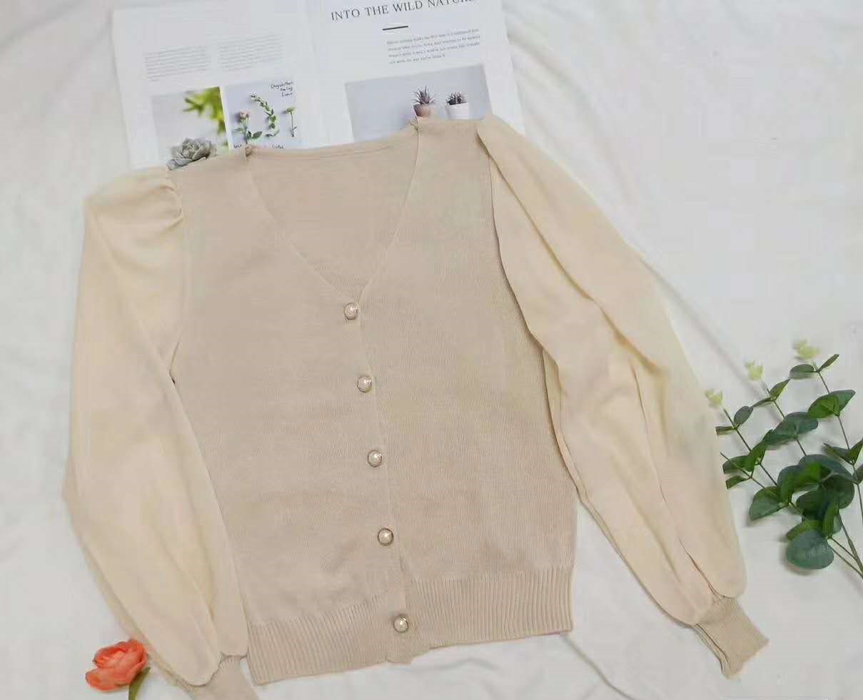 여름 새로운 한국 스타일 니트 스웨터 올 매치 V-넥 루즈한 가디건 메쉬 스티치 쉬폰 소매 진주 버클 탑 여성용스토어 가기