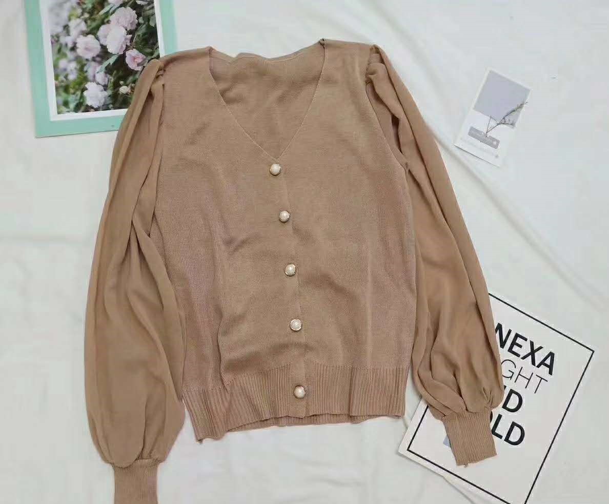 여름 새로운 한국 스타일 니트 스웨터 올 매치 V-넥 루즈한 가디건 메쉬 스티치 쉬폰 소매 진주 버클 탑 여성용