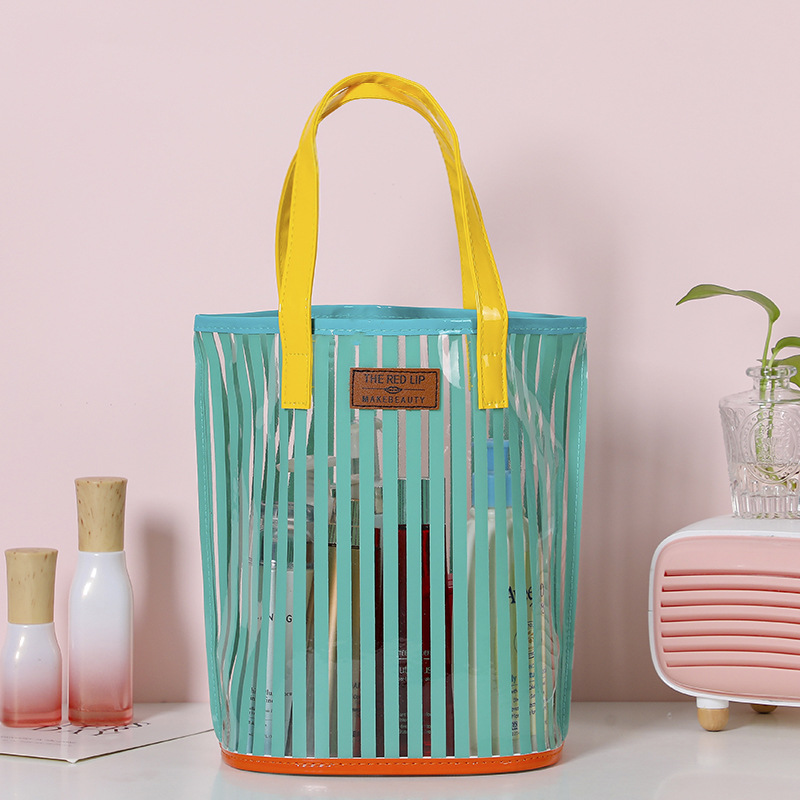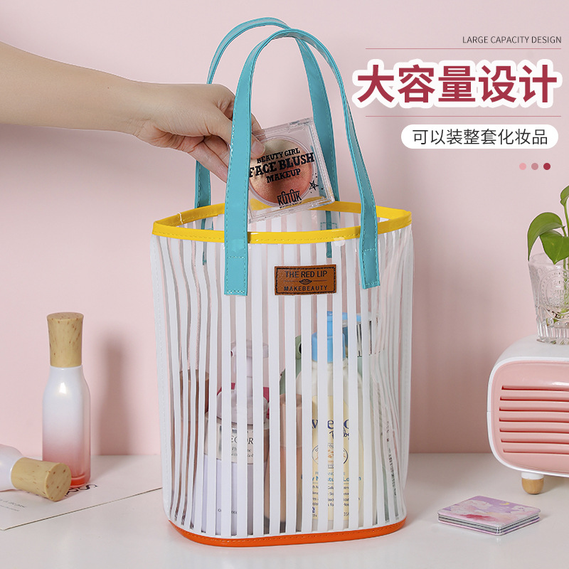 2022 New 스트라이프 핸드백 워시 백 소녀 하트 투명 PVC 젤리 백 휴대용 대용량 비치 백스토어 가기