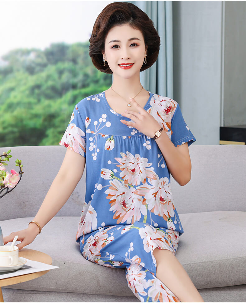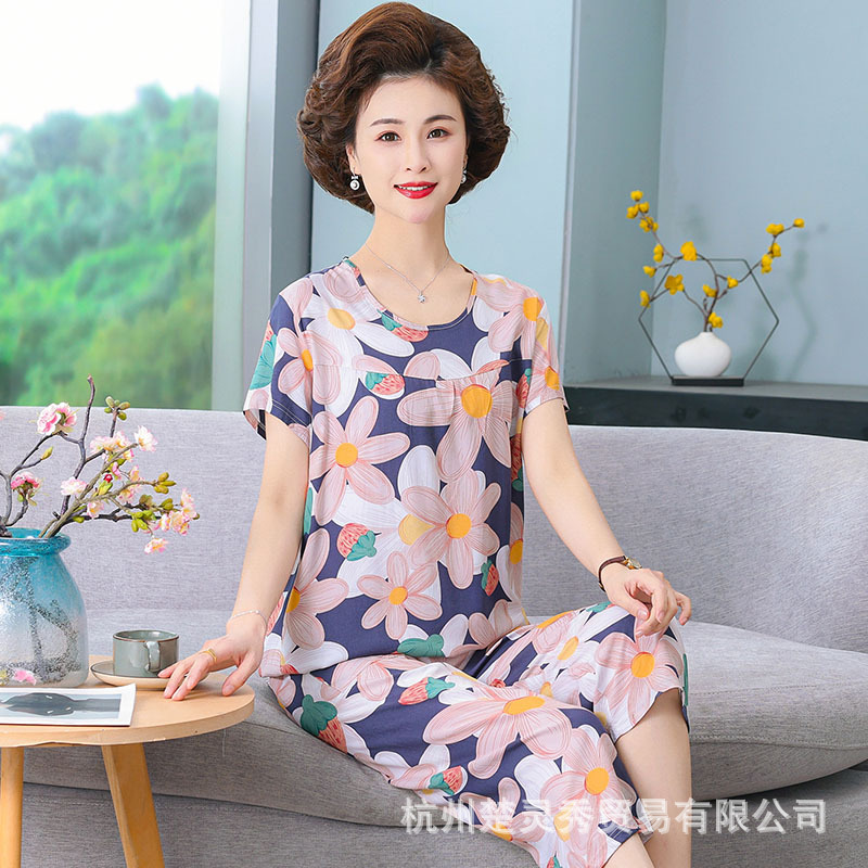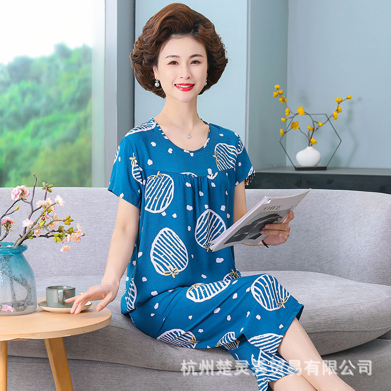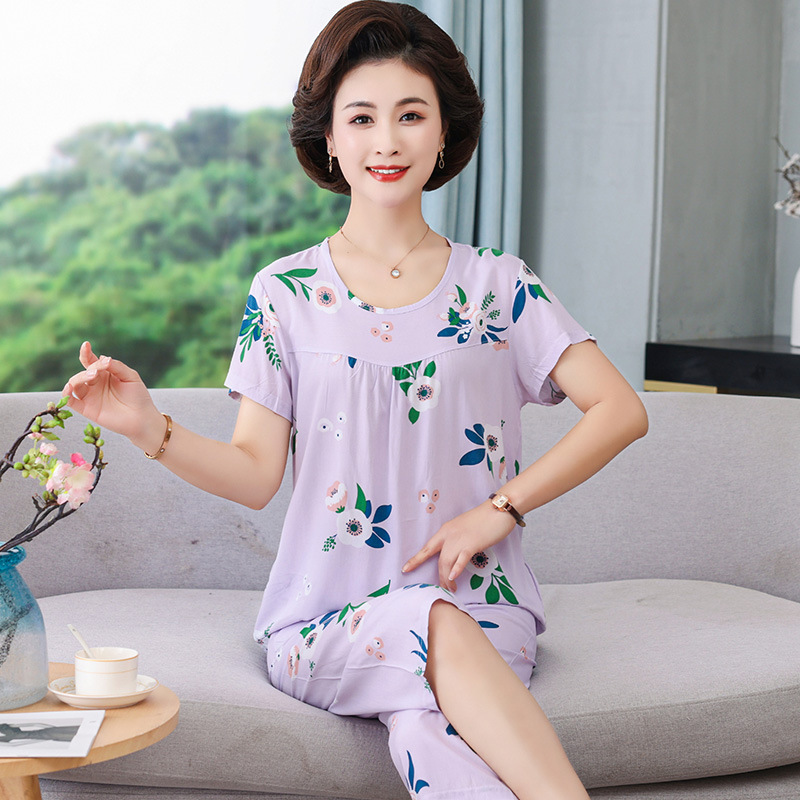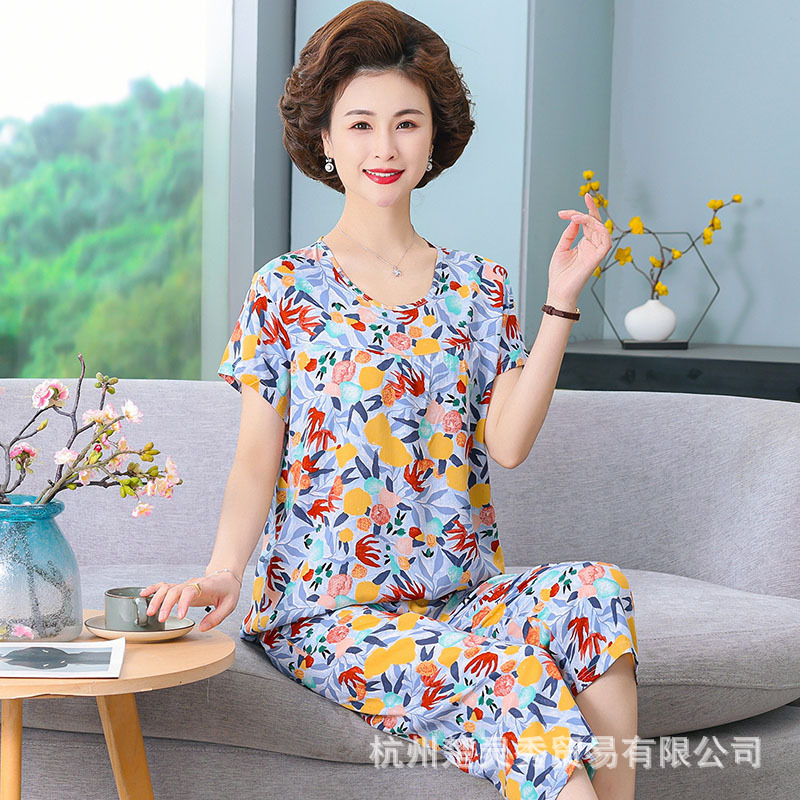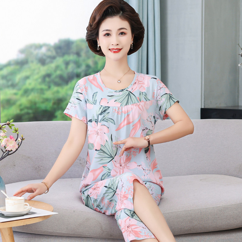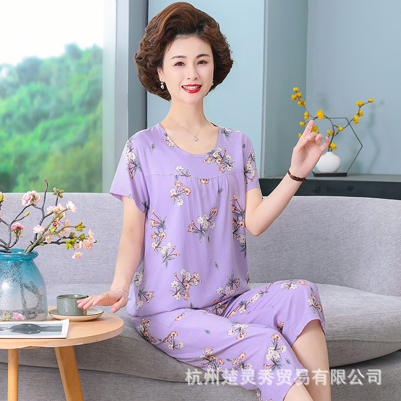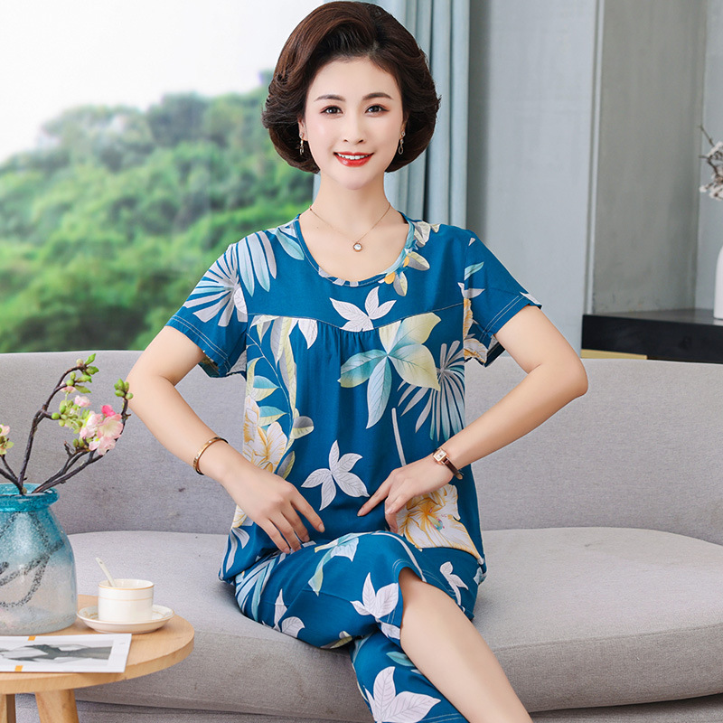 엄마 잠옷 봄과 가을 여성의 중년 및 노인 반팔 세트 면 실크 홈 의류 인공 면 여성 캐주얼 플러스 사이즈 여름스토어 가기