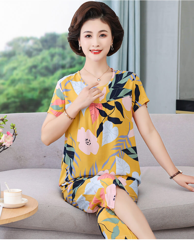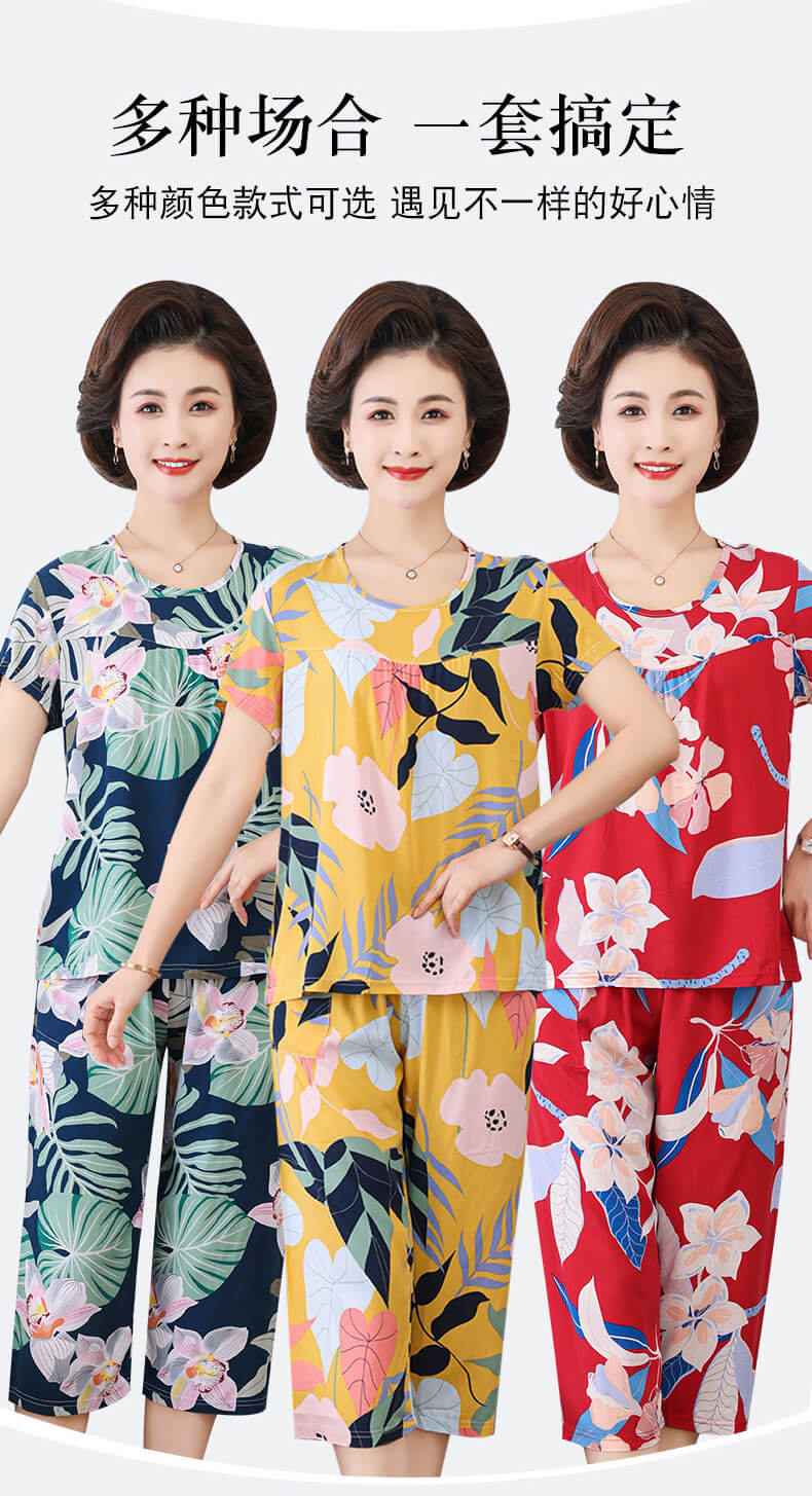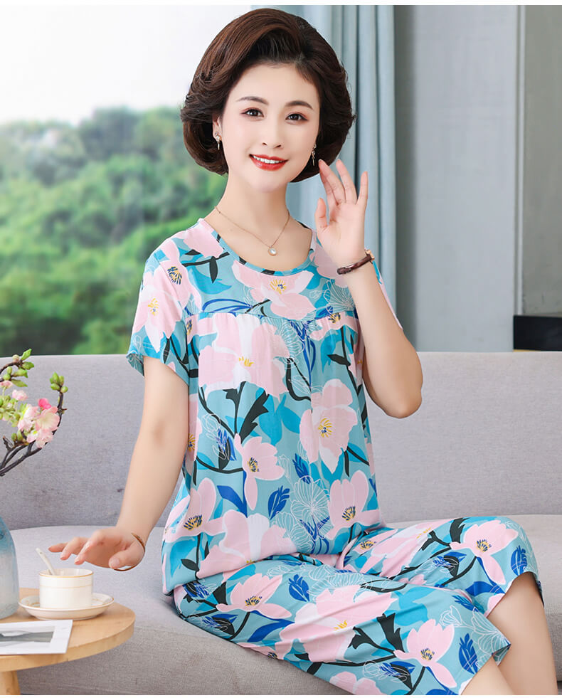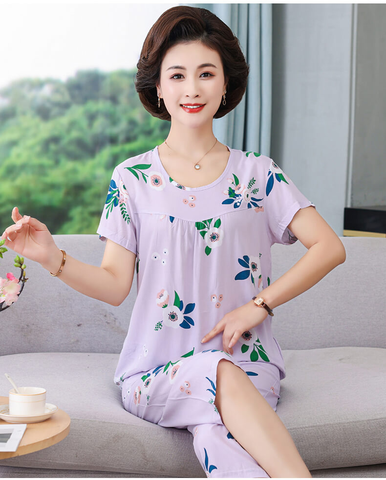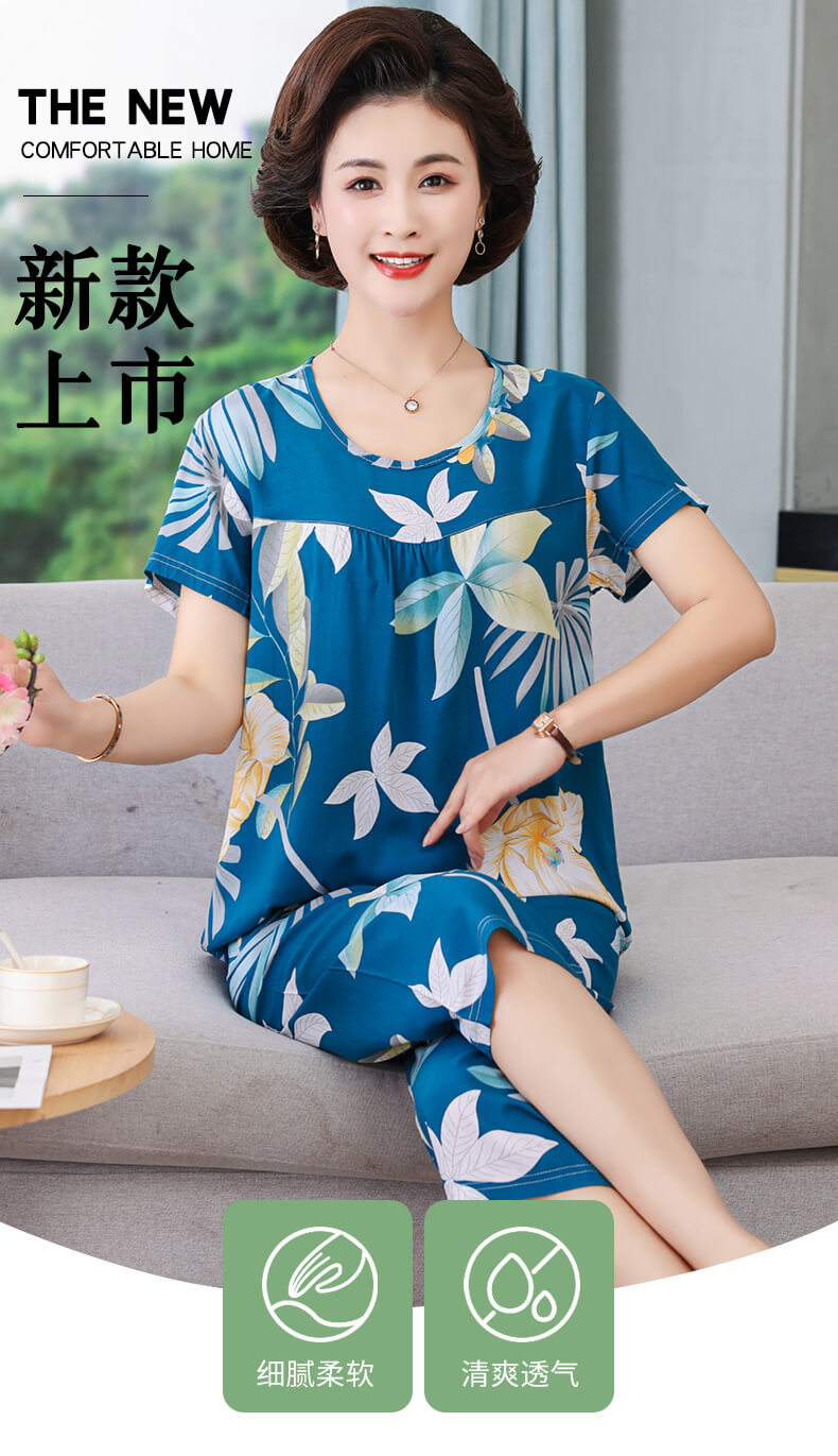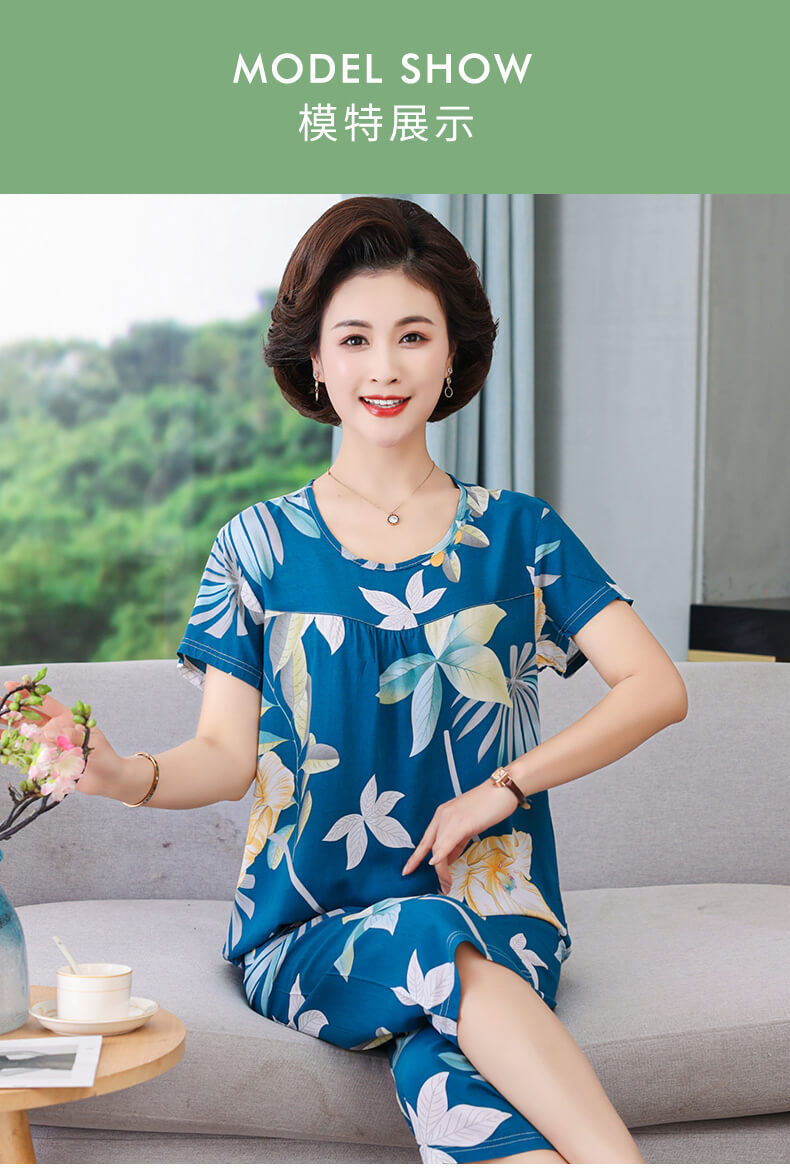 엄마 잠옷 봄과 가을 여성의 중년 및 노인 반팔 세트 면 실크 홈 의류 인공 면 여성 캐주얼 플러스 사이즈 여름스토어 가기