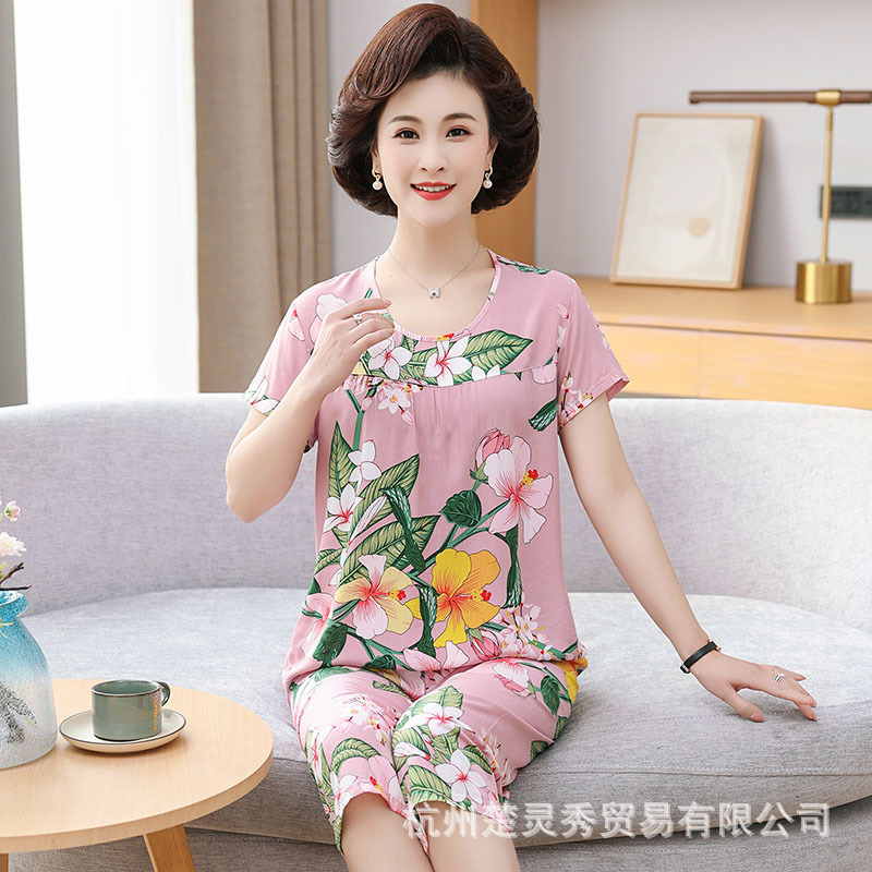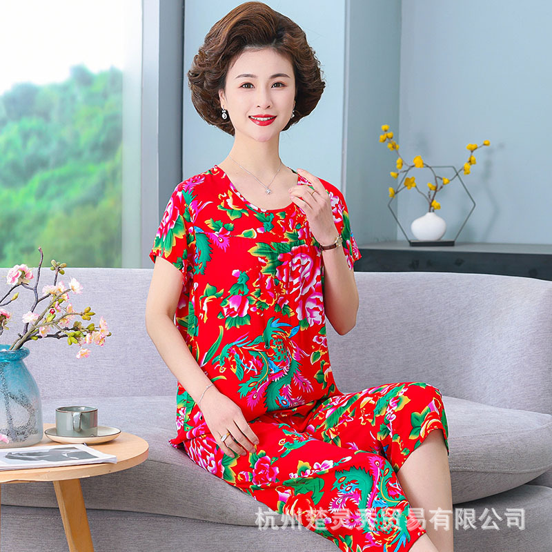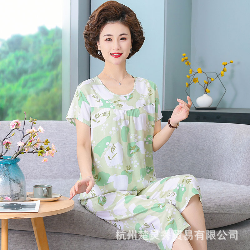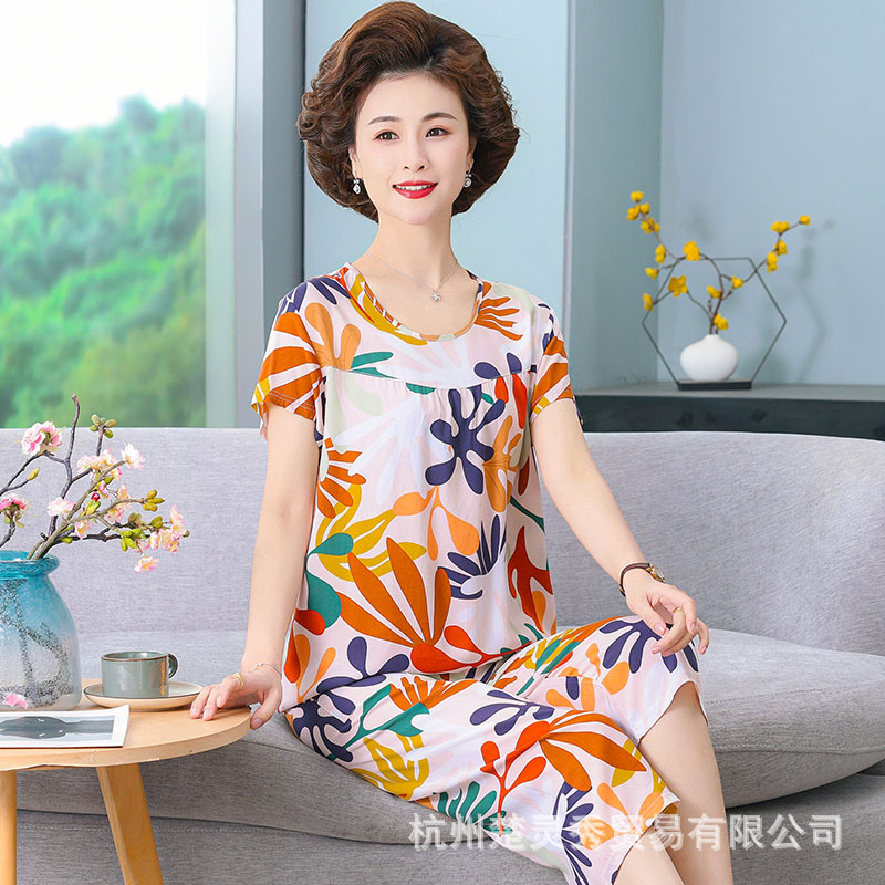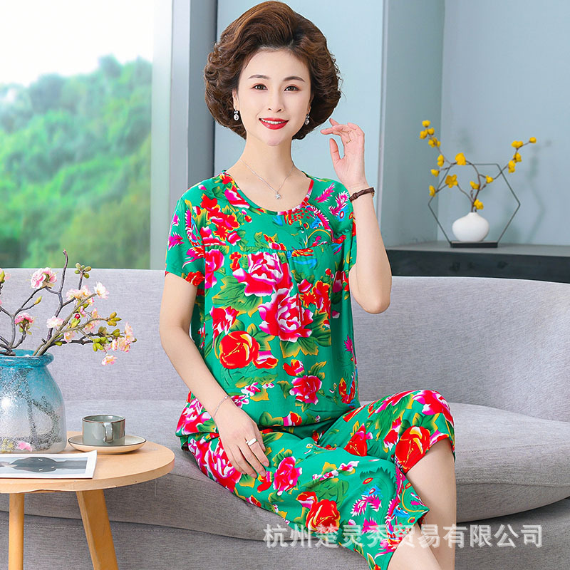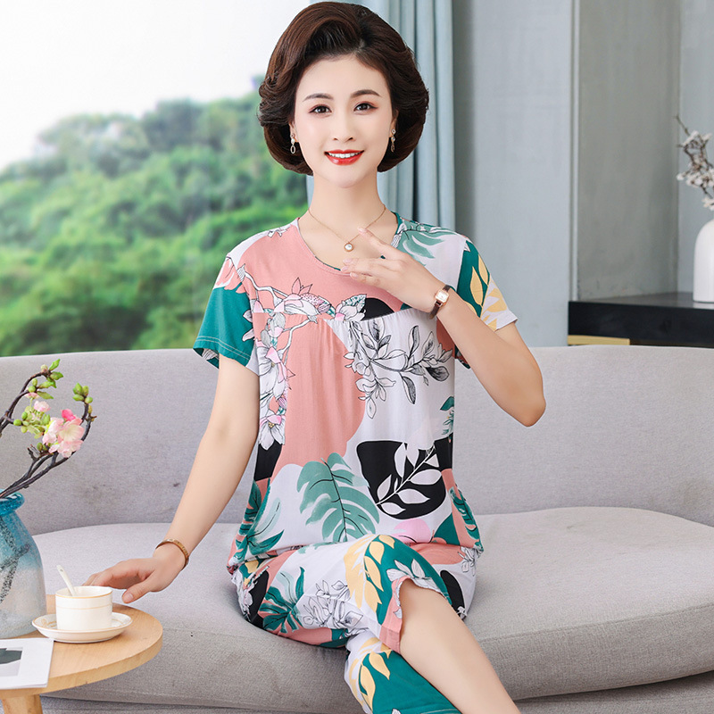 엄마 잠옷 봄과 가을 여성의 중년 및 노인 반팔 세트 면 실크 홈 의류 인공 면 여성 캐주얼 플러스 사이즈 여름
