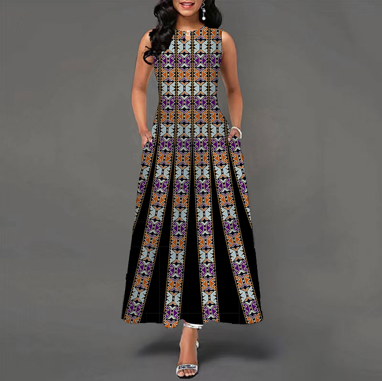 크로스 보더 아마존 유럽과 미국 라운드 넥 민소매 조끼 인쇄 원피스 포켓 허리 플러스 사이즈 긴 원피스 큰 스윙 원피스 여성용스토어 가기