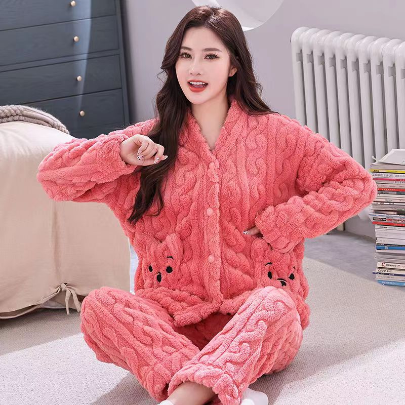 요정 산호 양털 잠옷 여자의 겨울 두꺼운 기모 학생 귀여운 카디건 아웃웨어 느슨한 가정 옷 세트스토어 가기