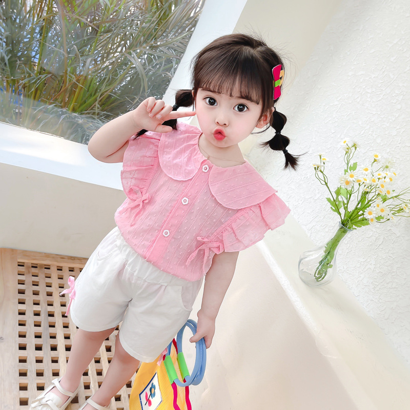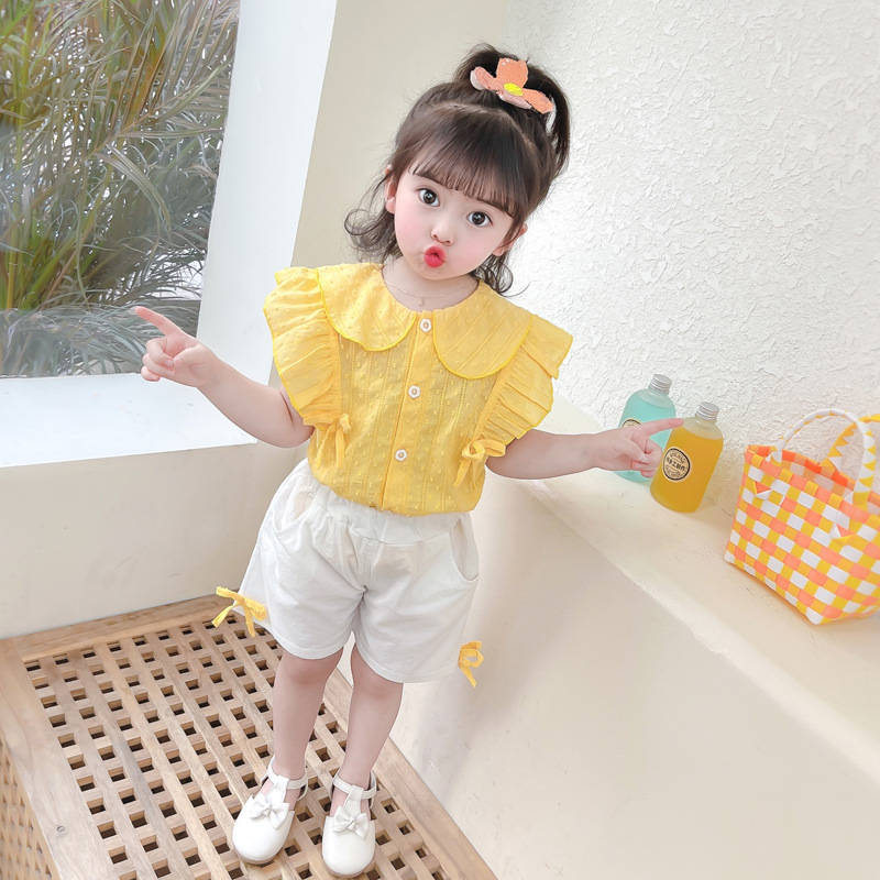 여자 단색 서양 스타일 반팔 아동복 어린이 여름 착용 얇은 옷깃 셔츠 조끼 공주 티셔츠 카디건 세트스토어 가기