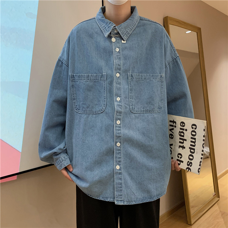 데님 긴팔 셔츠 남자의 단색 가을 한국 유행 심플 셔츠 홍콩 스타일 느슨한 잘 생긴 재킷