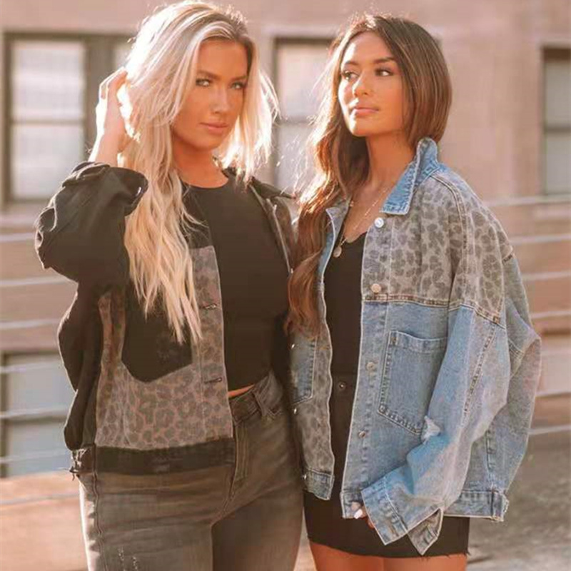 크로스 국경 가을과 겨울 아마존 데님 코트 여자의 긴 소매 독립 역 유럽과 미국 데님 재킷 코트 여자의 표범 바느질스토어 가기