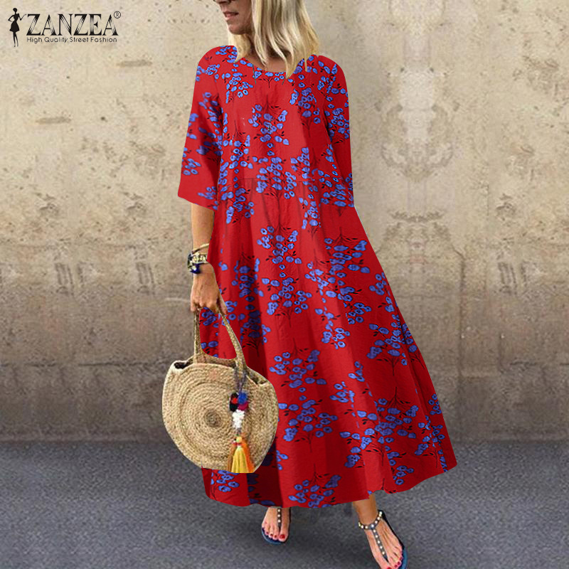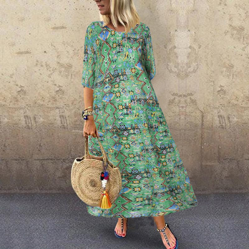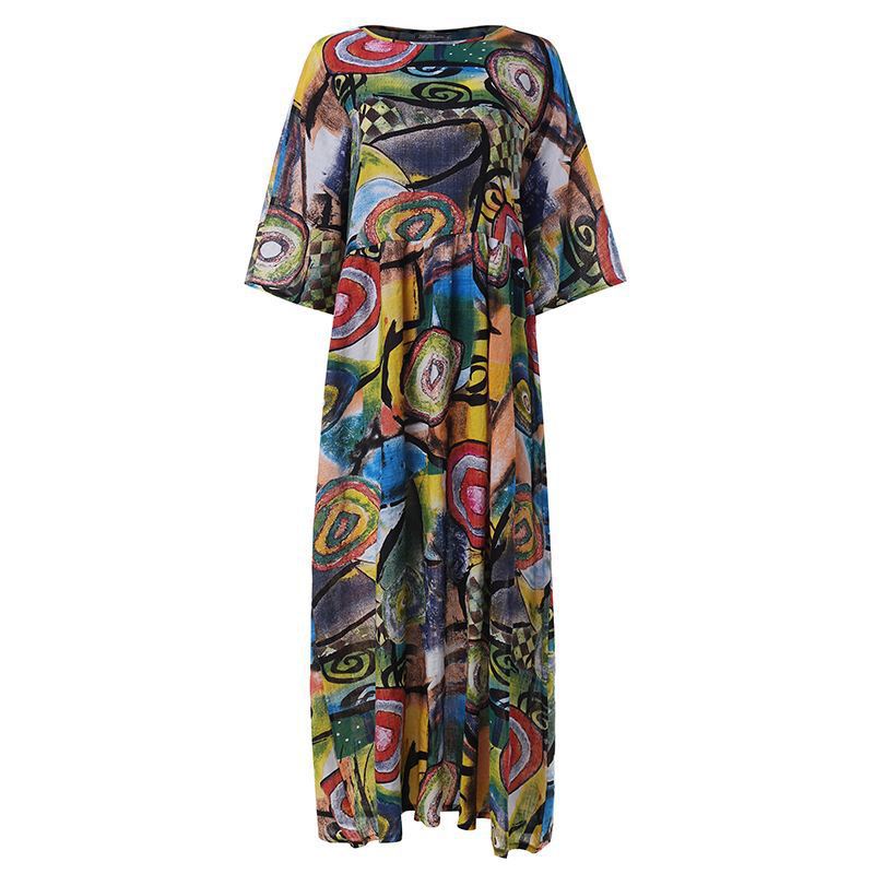 新款春季文艺气质女装印花短袖圆领大摆型连衣裙
