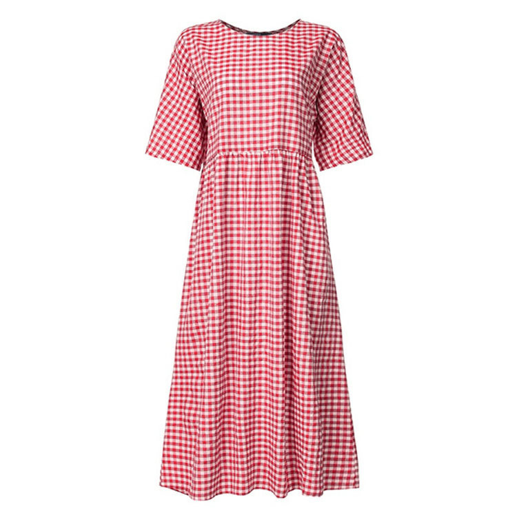 유럽과 미국의 2021 새로운 봄 격자 무늬 여름 캐주얼 예술적 기질 반팔 둥근 목 큰 진자 원피스