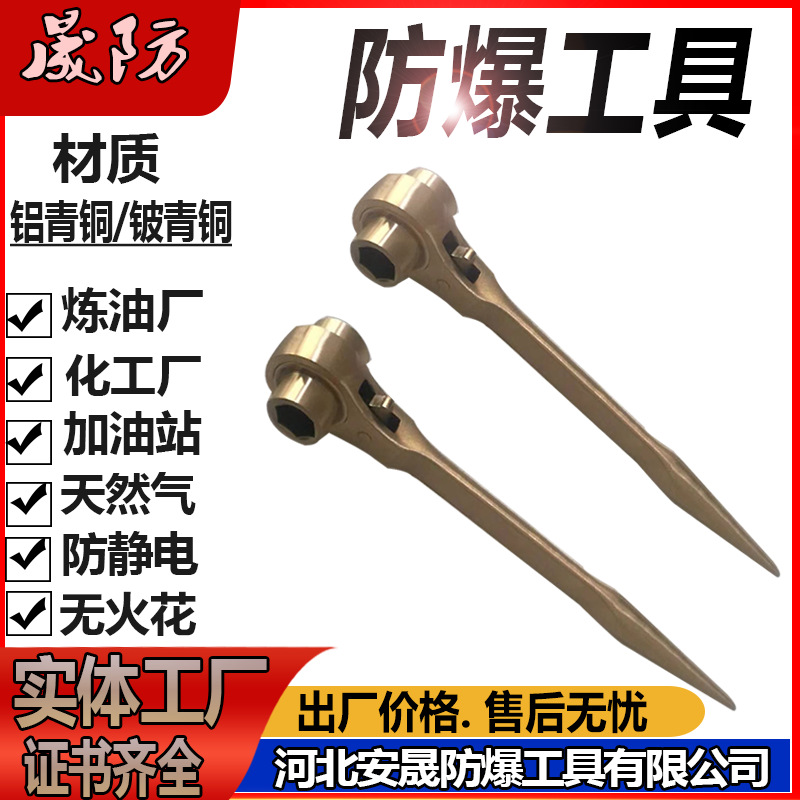 【产品材质】:防爆工具以铍青铜和铝青铜为原料,铍青铜合金、铝青铜合金在撞击或磨擦时不发生火花,是易爆、易燃、强磁及腐蚀性场合下使用的理想工具。