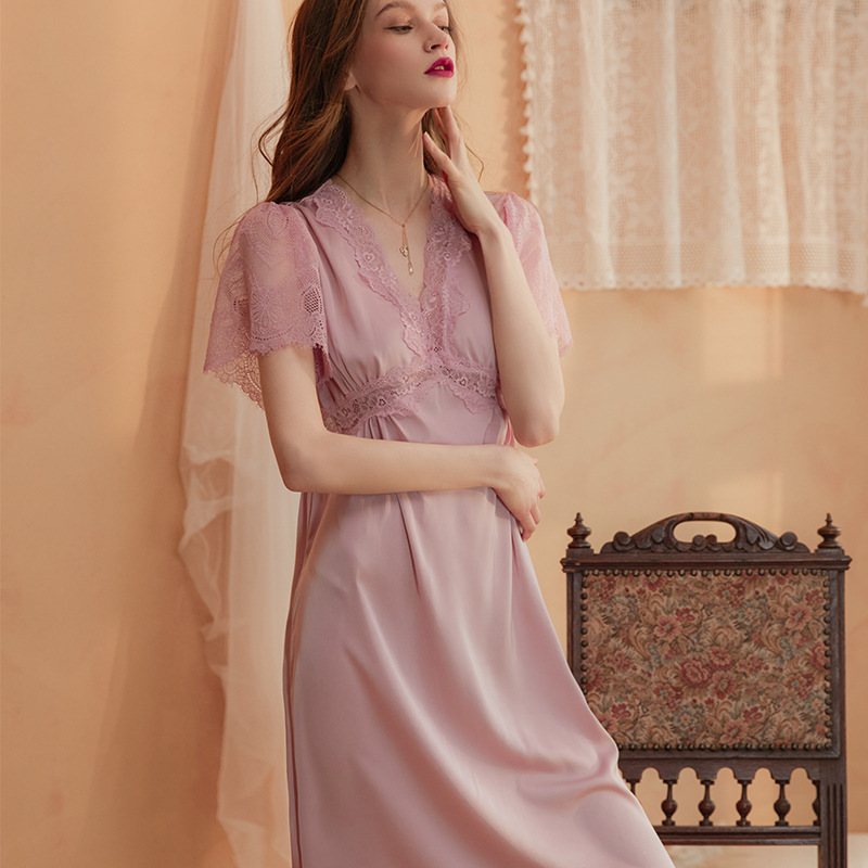 봄과 여름 신부 결혼식 아침 가운 반팔 긴 원피스 웨딩 잠옷 독특한 레이스 중공 섹시한 잠옷스토어 가기