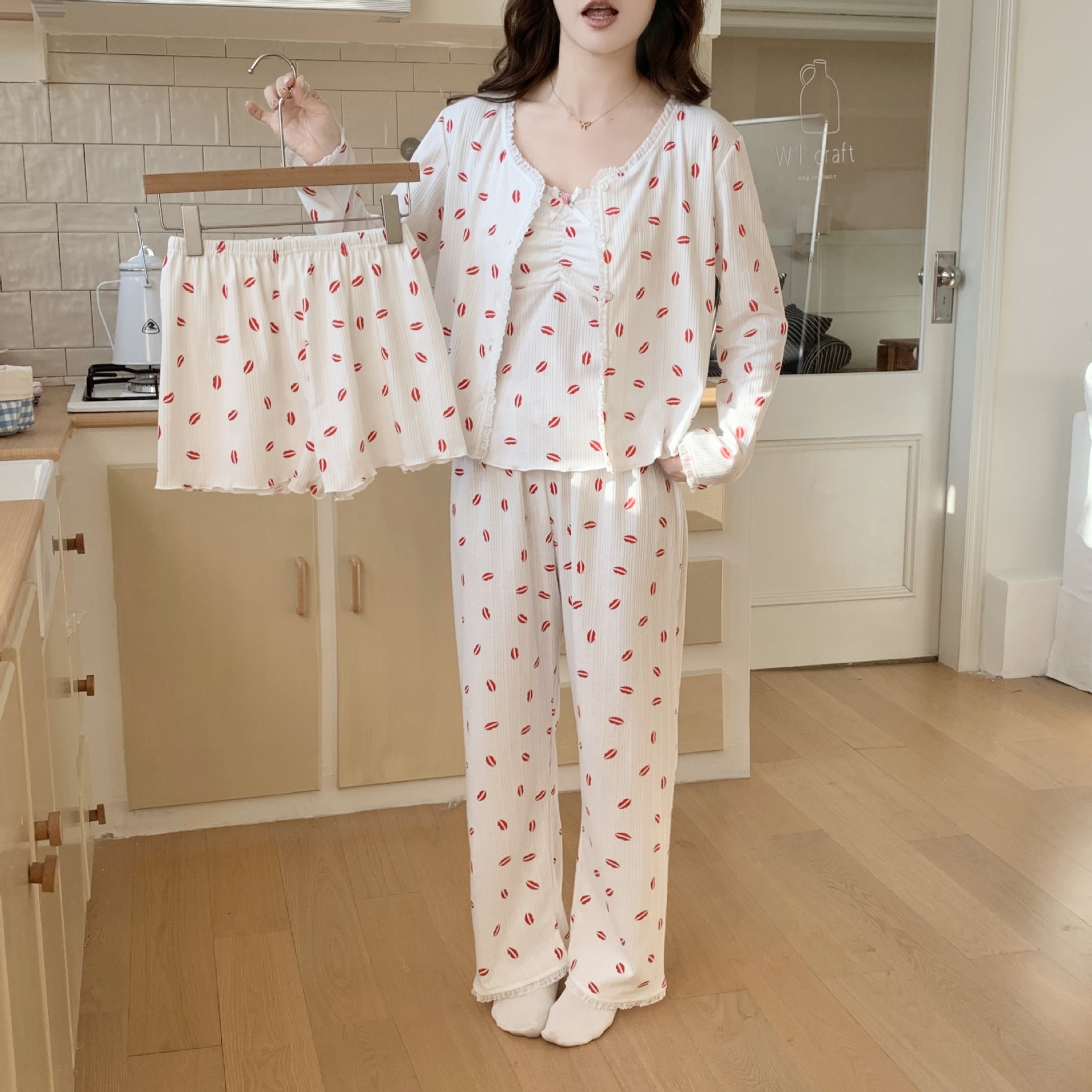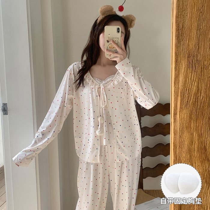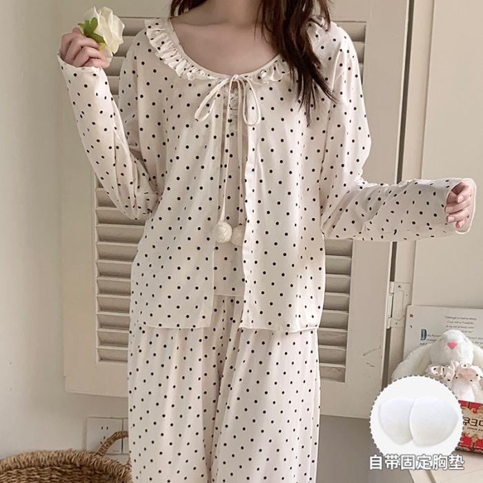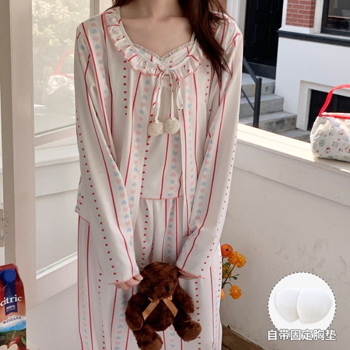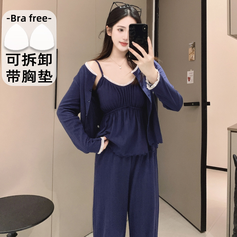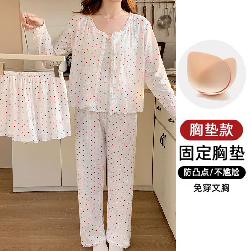 봄 새로운 일본식 순수한 욕망 스타일 잠옷 여성용 한국식 긴팔 3 종 세트 카디건 가슴 패드 섹시 달콤한 가정복