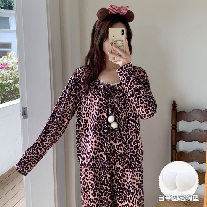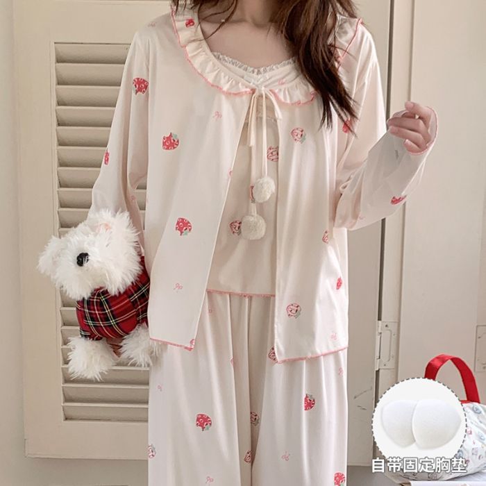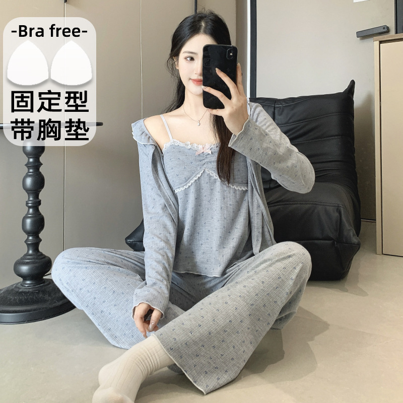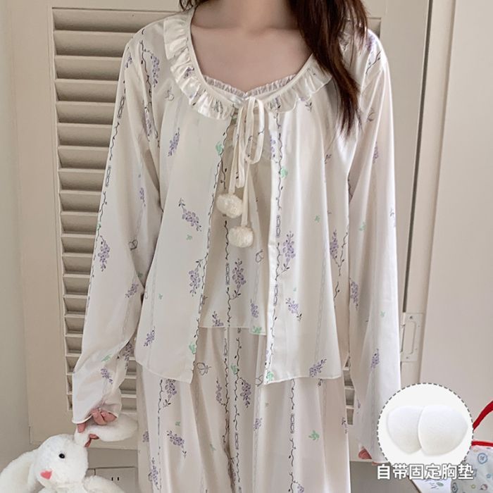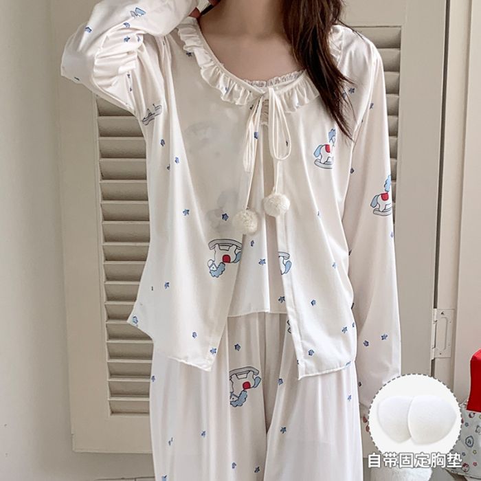 봄 새로운 일본식 순수한 욕망 스타일 잠옷 여성용 한국식 긴팔 3 종 세트 카디건 가슴 패드 섹시 달콤한 가정복스토어 가기