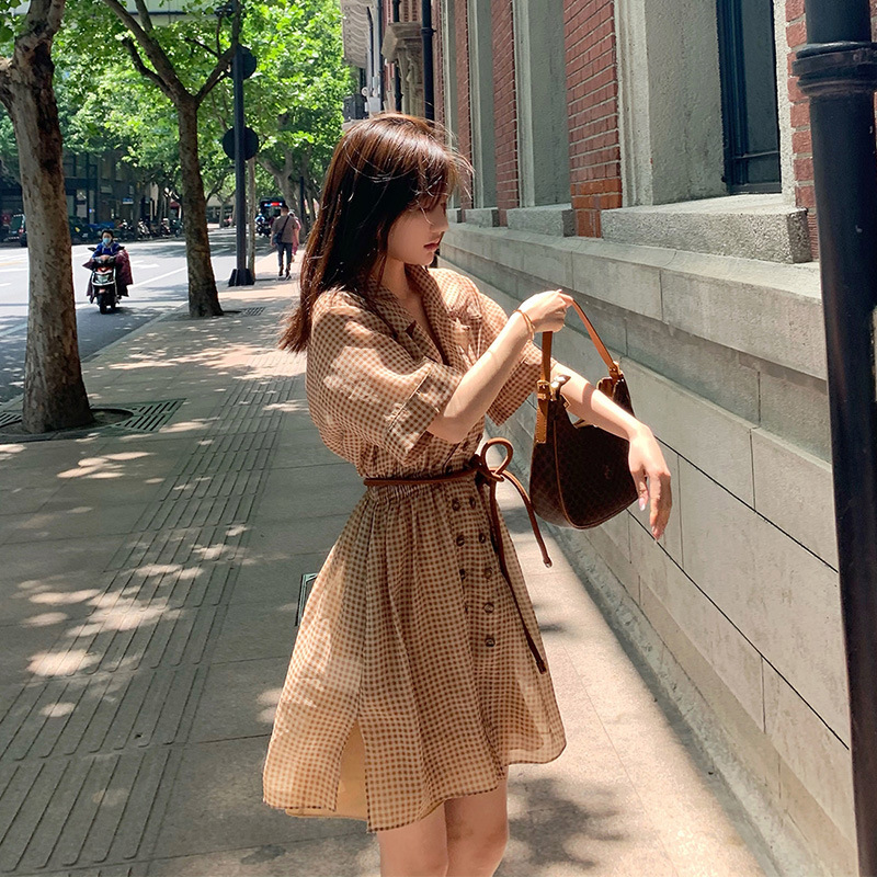 8277 여름 새로운 요정 허리 차 휴식 프랑스 복고풍 V-넥 달콤한 얇은 격자 무늬 셔츠 원피스 여성스토어 가기