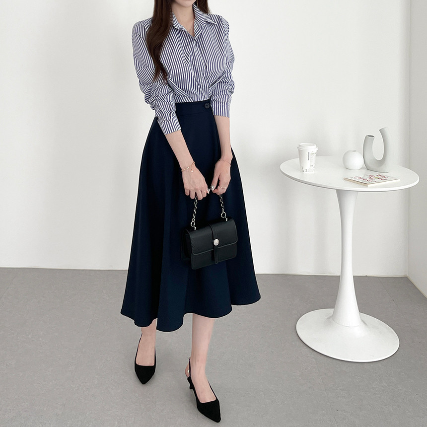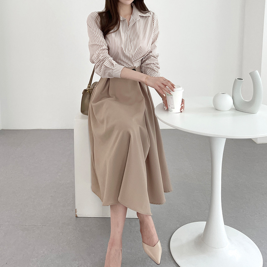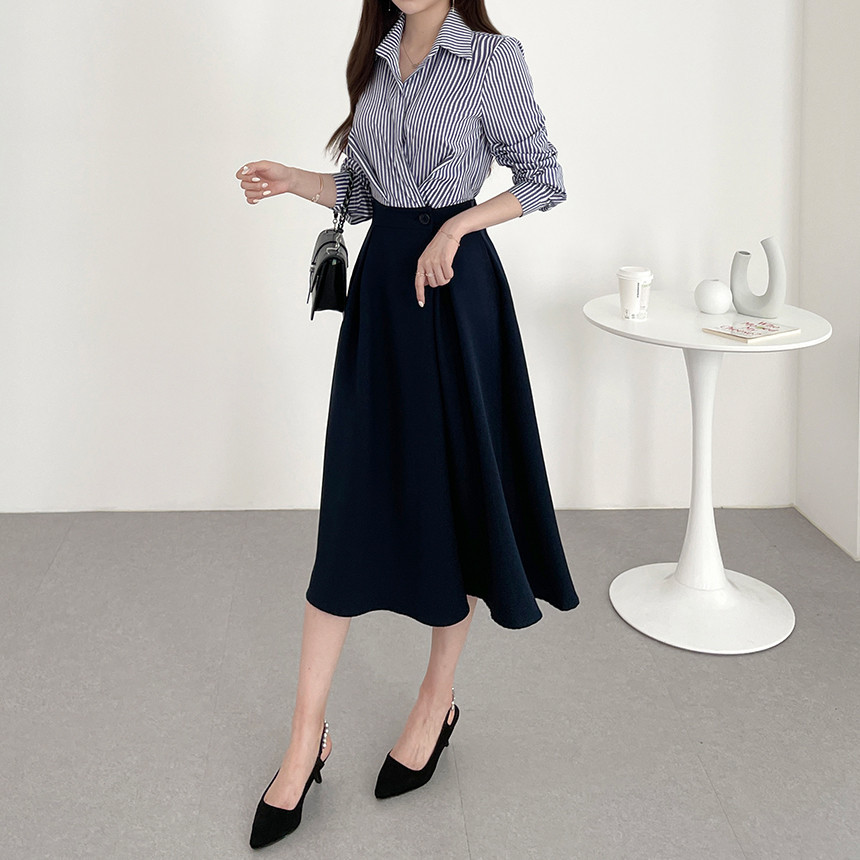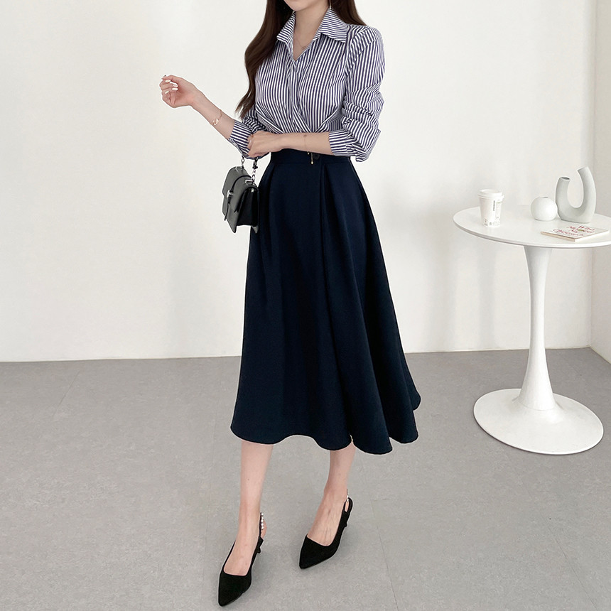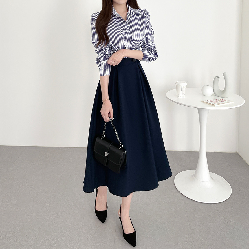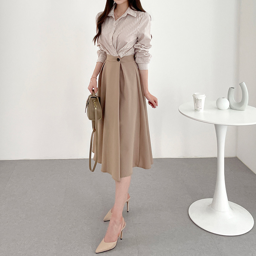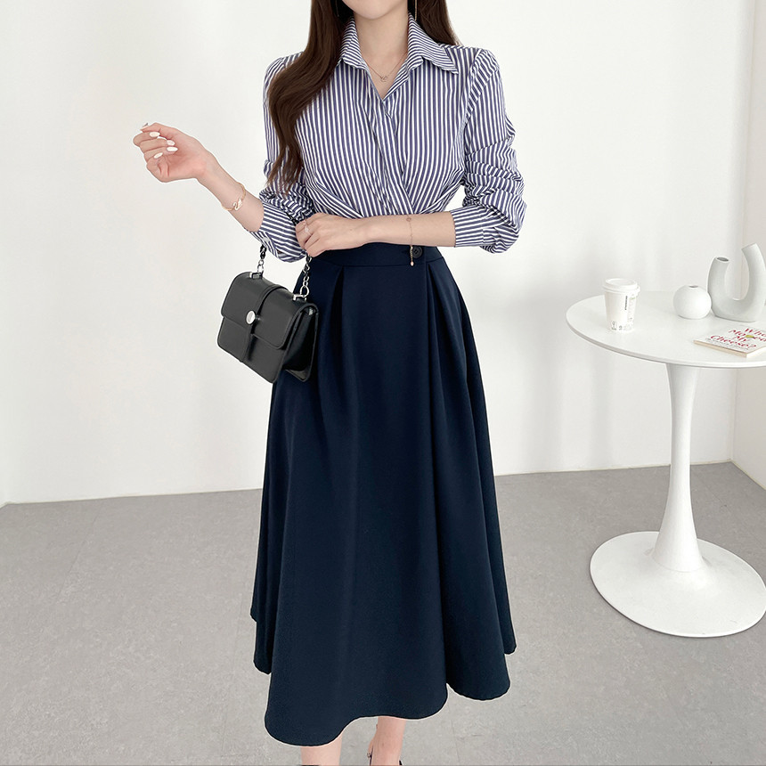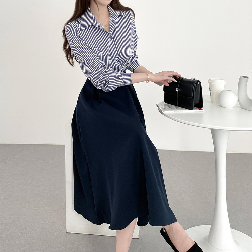 한국 인 우아하고 가벼운 성숙한 틈새 원버튼 디자인 센스 기질 폴로 칼라 패셔너블한 하이웨이스트 긴팔 드레스스토어 가기