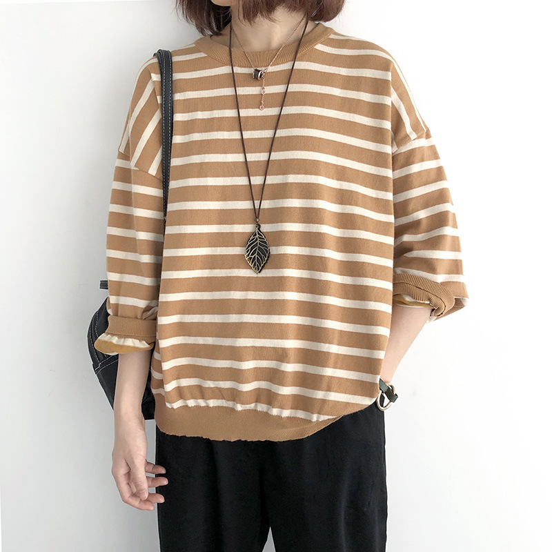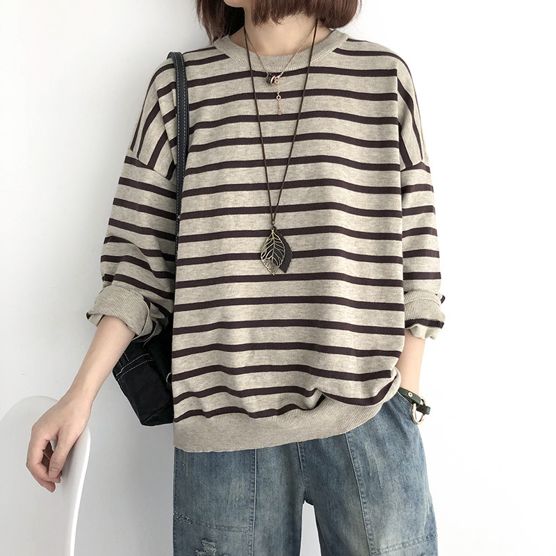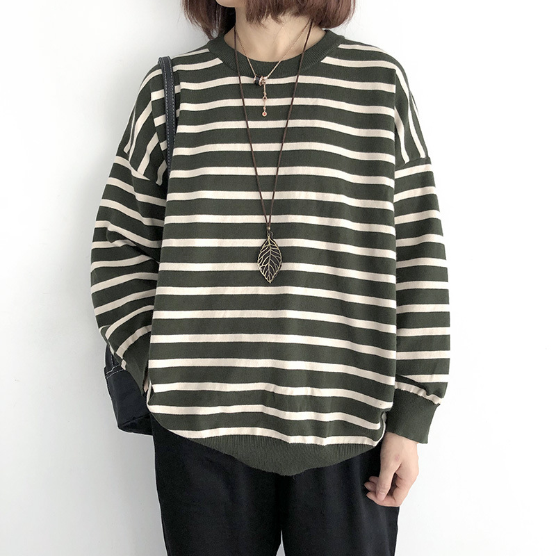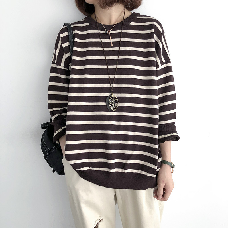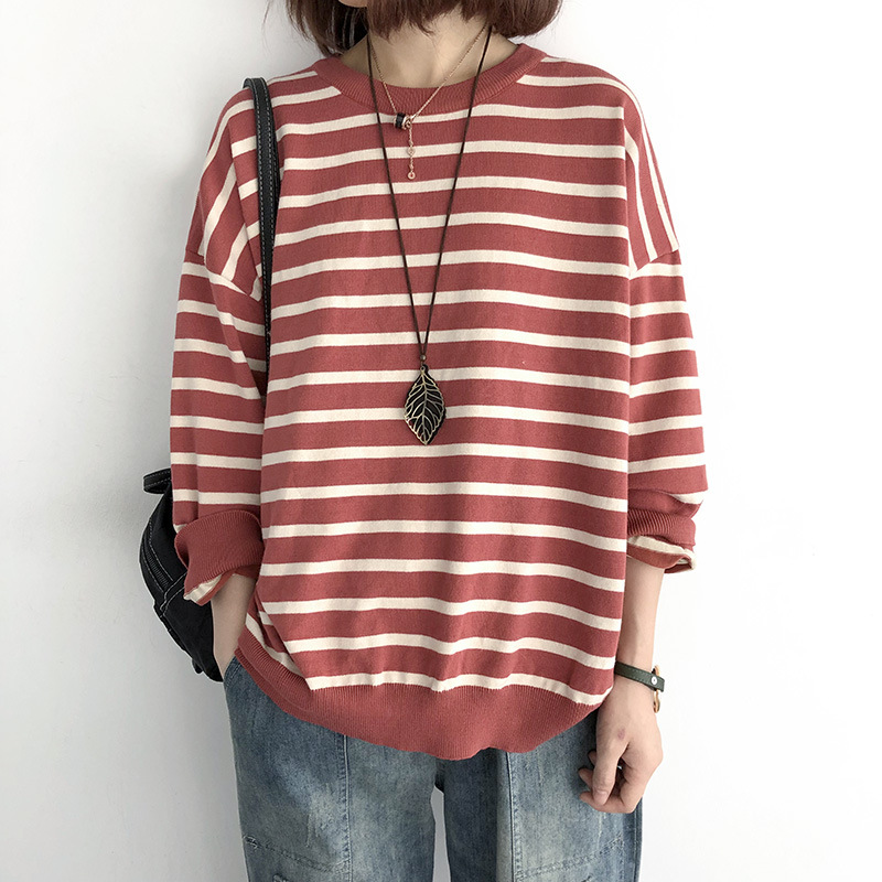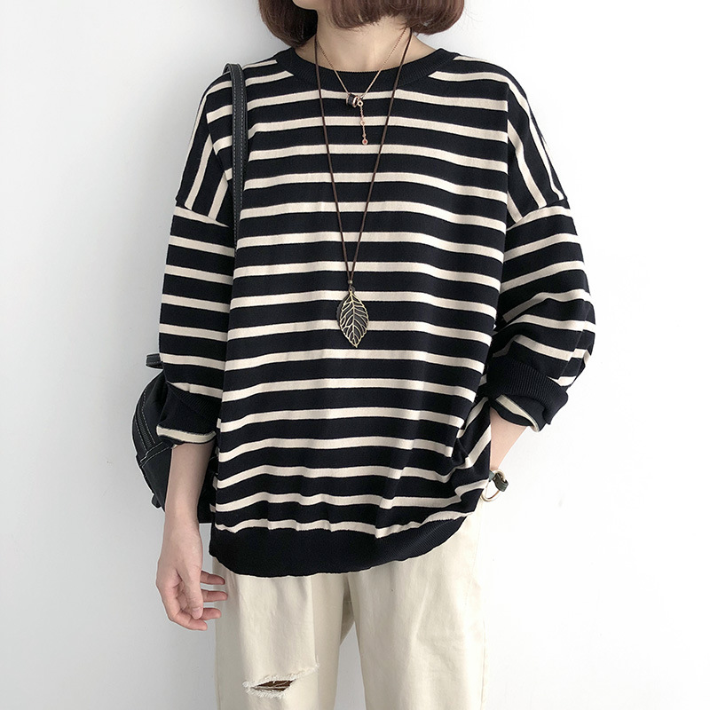 9166 # 봄과 가을 느슨한 플러스 사이즈 풀오버 니트 스웨터 스트라이프 긴 소매 여자의 최고 슬림 착용베이스 스웨터 조수스토어 가기