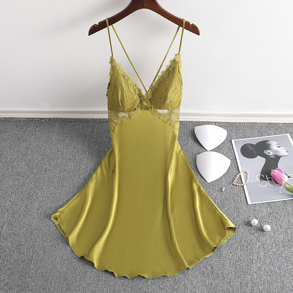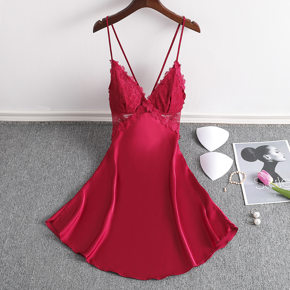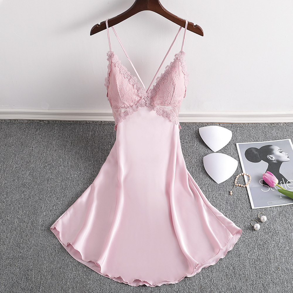 가슴 패드 백 크로스 중공 레이스 스커트 섹시 챠밍 아이스 실크 잠옷 여성용 얇은 잠옷 여름 유혹