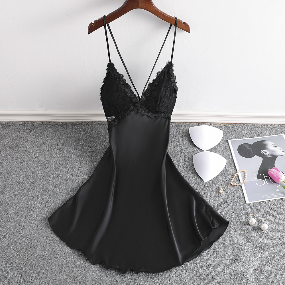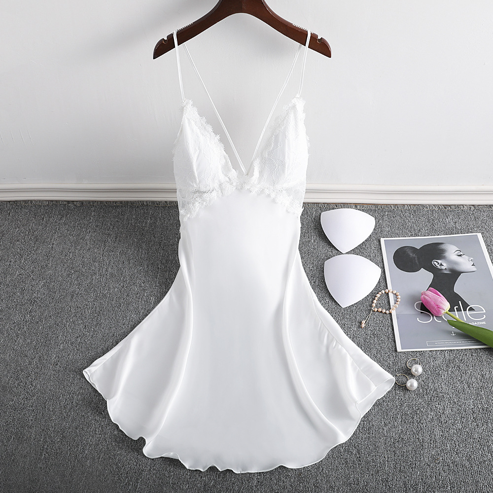 가슴 패드 백 크로스 중공 레이스 스커트 섹시 챠밍 아이스 실크 잠옷 여성용 얇은 잠옷 여름 유혹스토어 가기