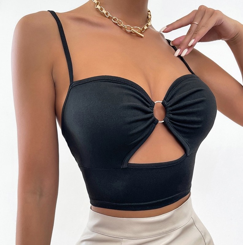 유럽과 미국에서 인기 있는 크로스보더 무지 컬러 블록 디자인 링 컷아웃 섹시 뷔스티에 탑