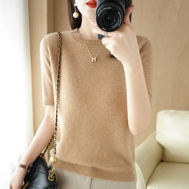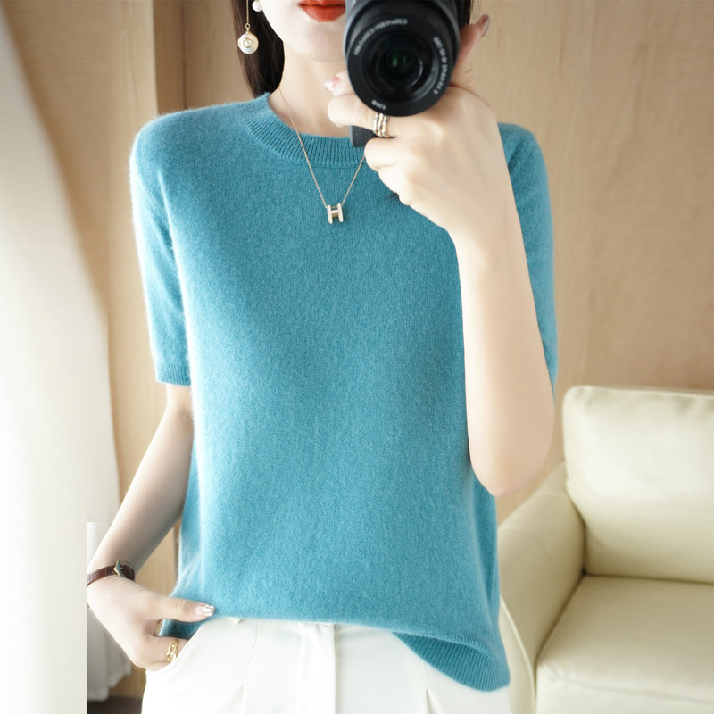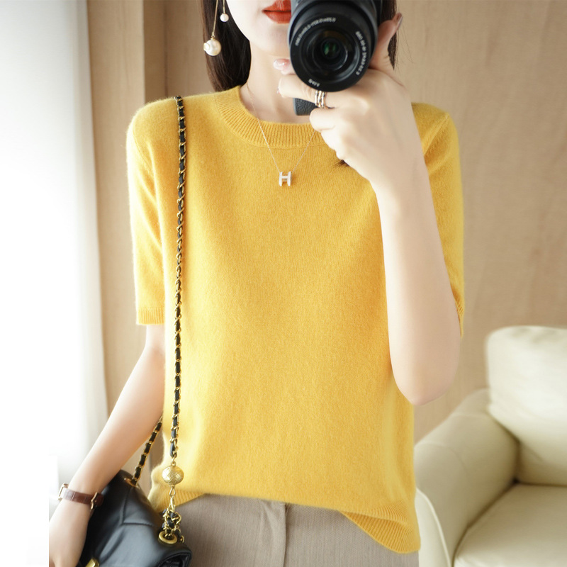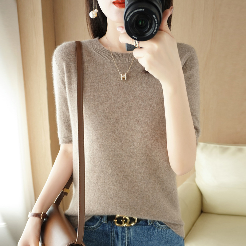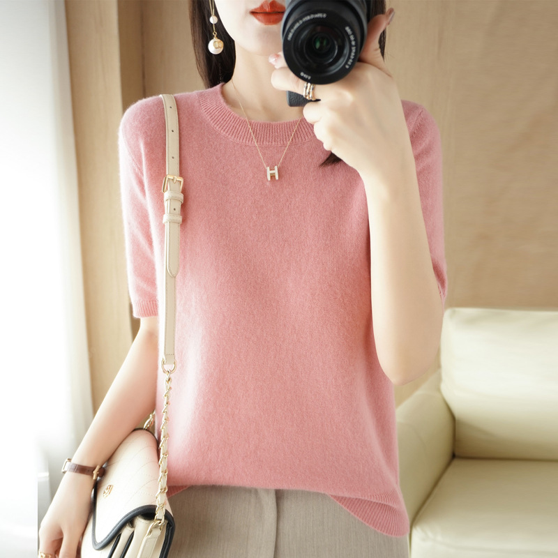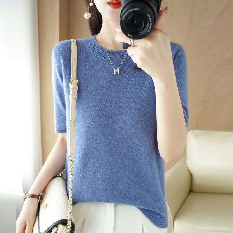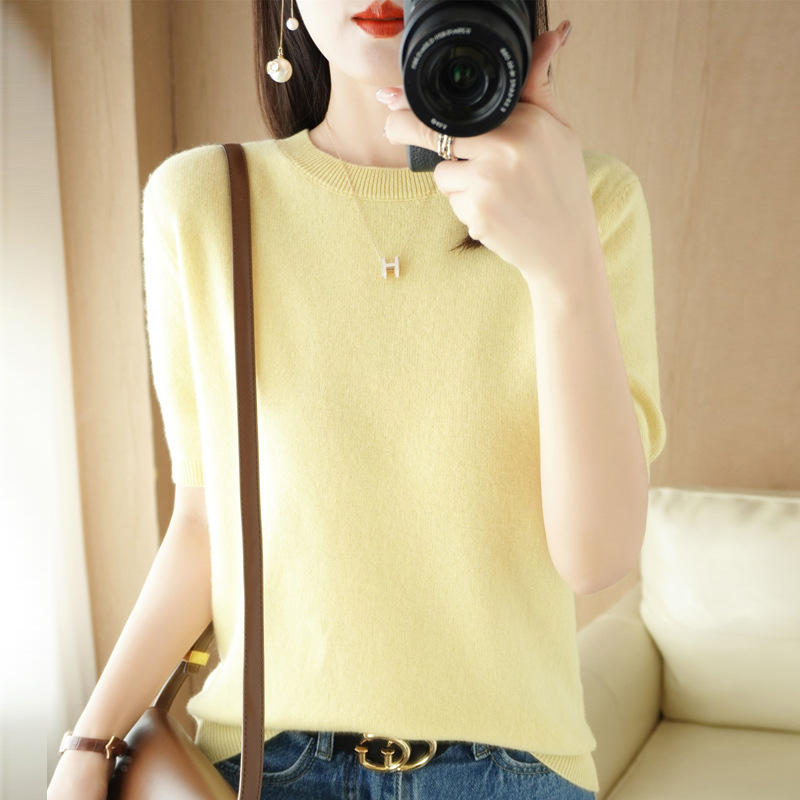 여름 새로운 얇은 스웨터 반팔 여성 슬림 솔리드 컬러 라운드 넥 단색 티셔츠 바닥 셔츠 여성 최고 도매스토어 가기