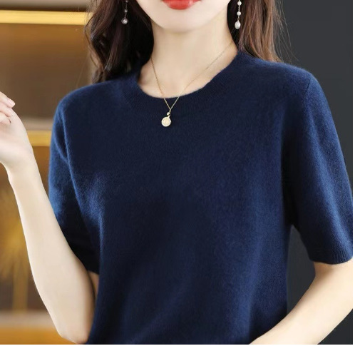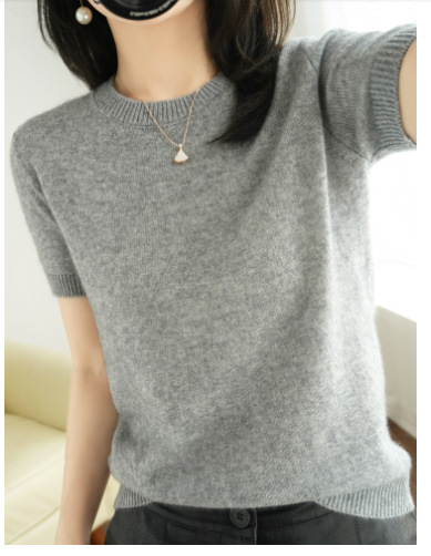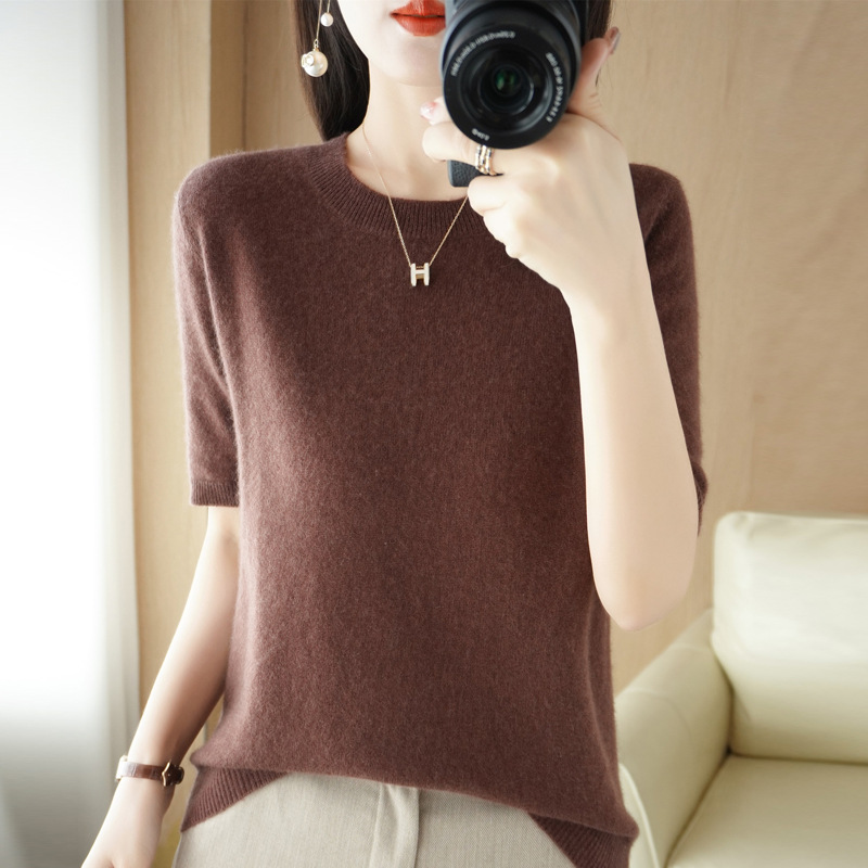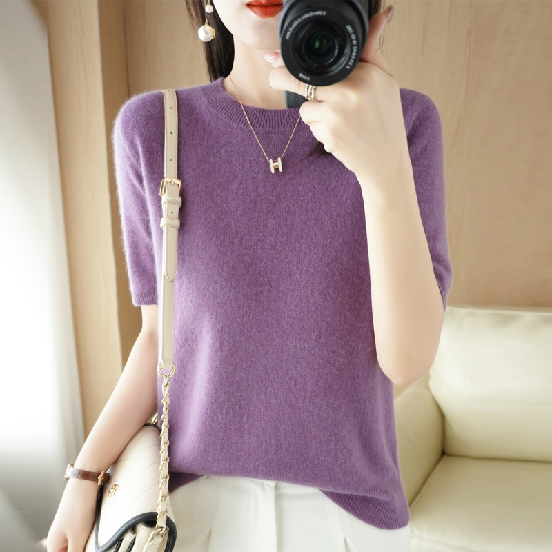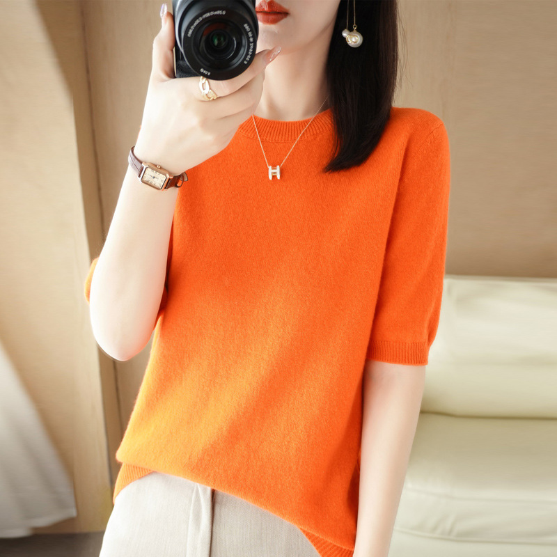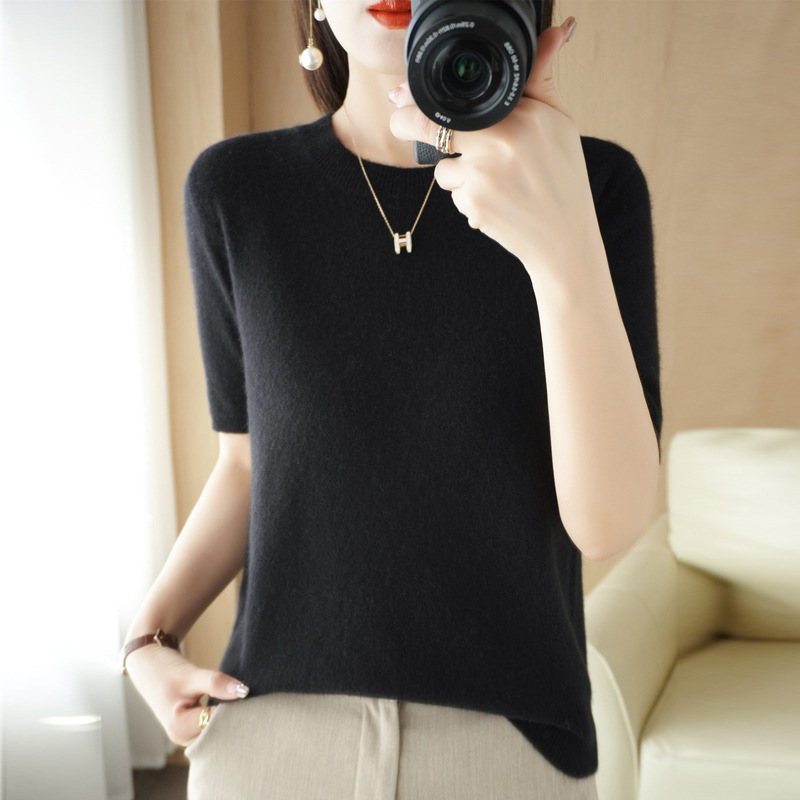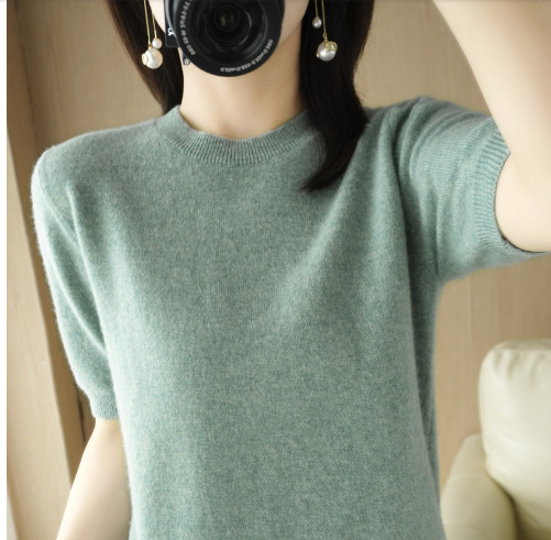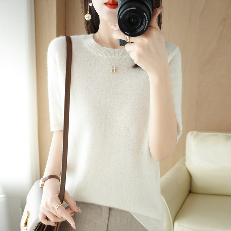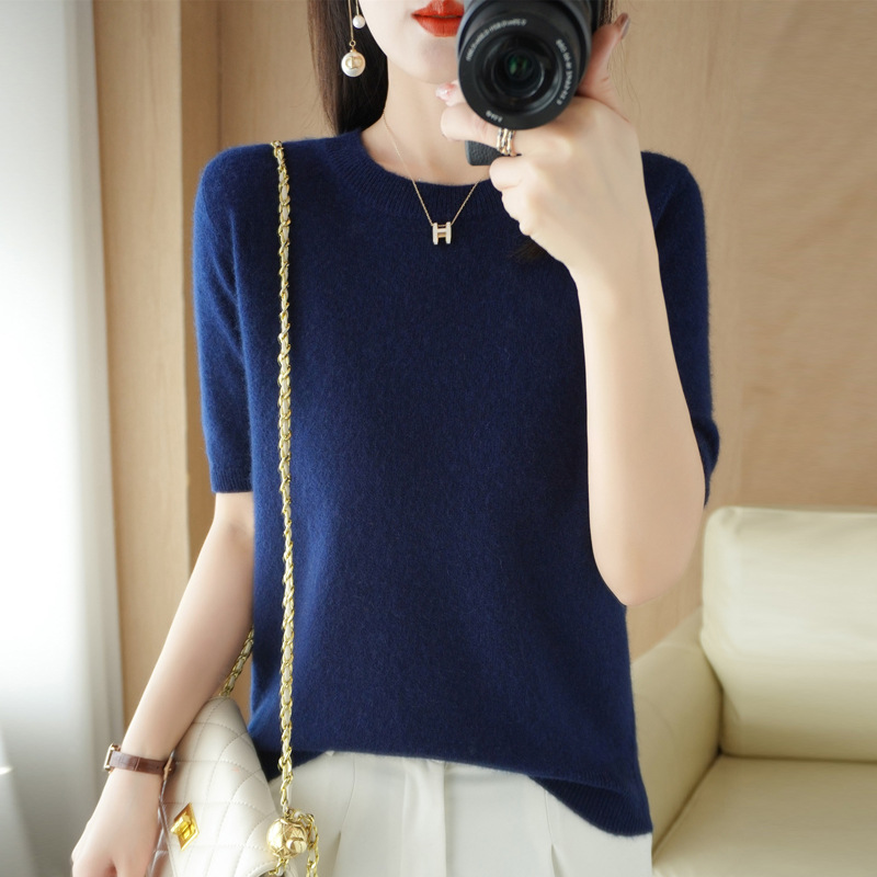 여름 새로운 얇은 스웨터 반팔 여성 슬림 솔리드 컬러 라운드 넥 단색 티셔츠 바닥 셔츠 여성 최고 도매스토어 가기