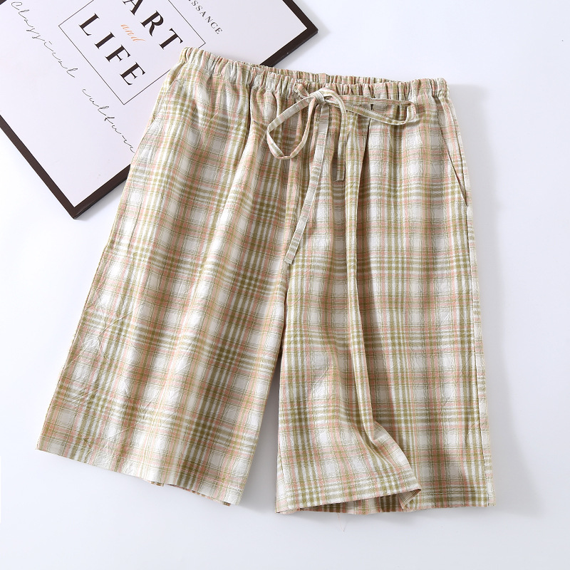 잠옷 바지 반바지 남자의 여름 빨 면 얇은 모든 면 일본식 격자 무늬 플러스 사이즈 느슨한 캐주얼 홈 바지