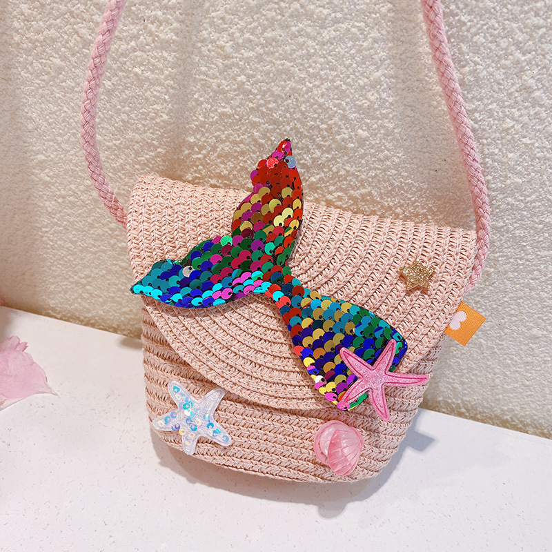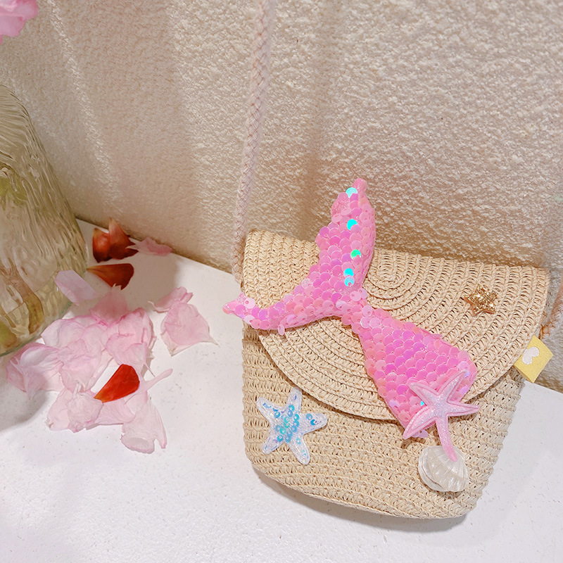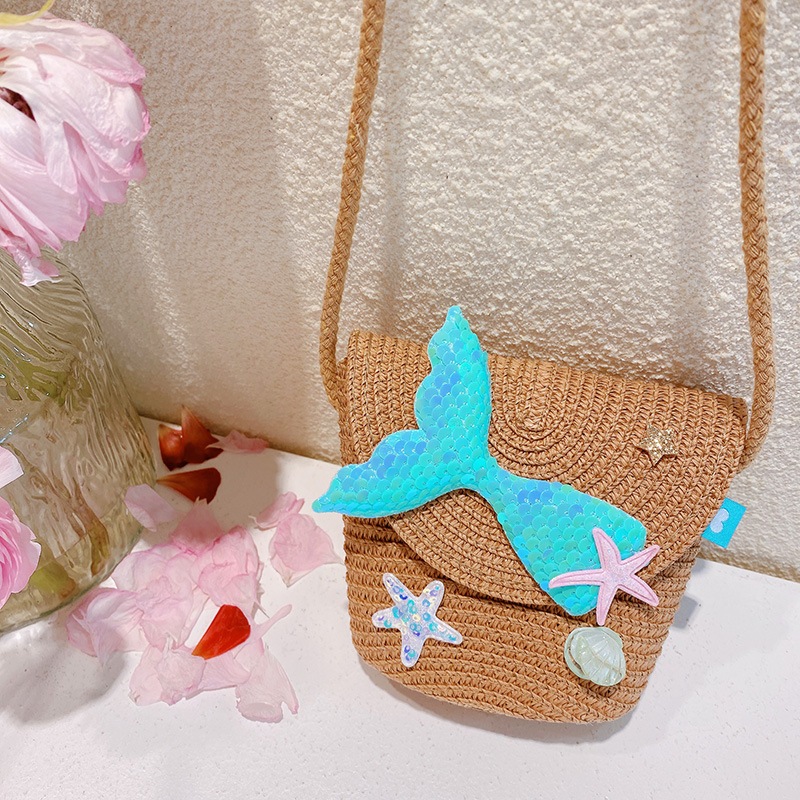 HD4178A05 스팽글 인어 불가사리 쉘 클램핑 밀짚 비치 가방 어린이 여행 크로스 바디 동전 지갑 가방