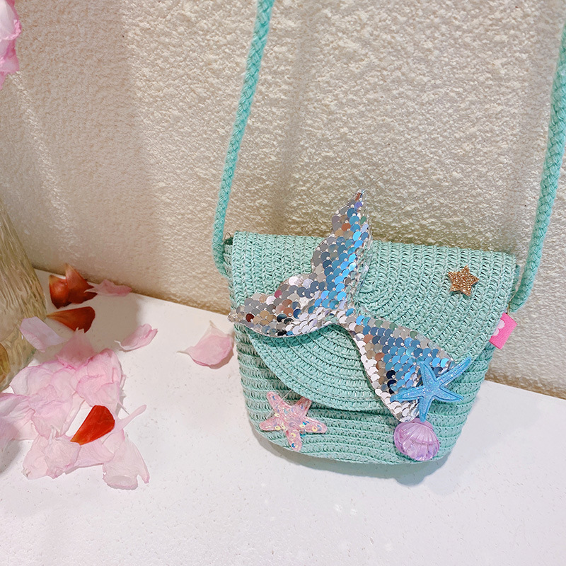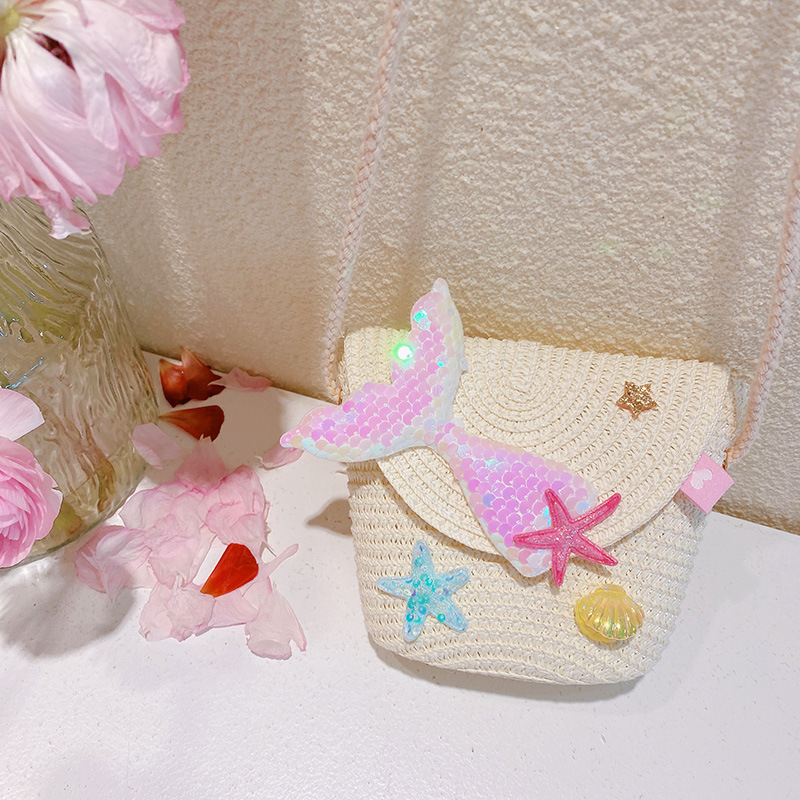 HD4178A05 스팽글 인어 불가사리 쉘 클램핑 밀짚 비치 가방 어린이 여행 크로스 바디 동전 지갑 가방스토어 가기