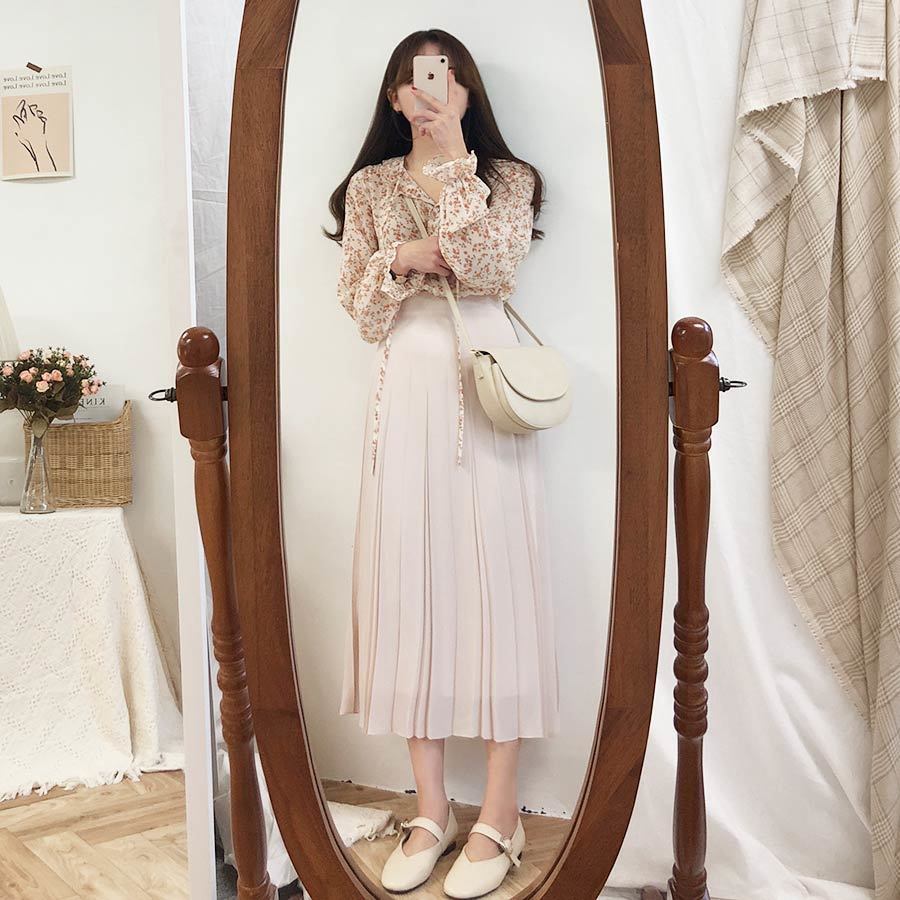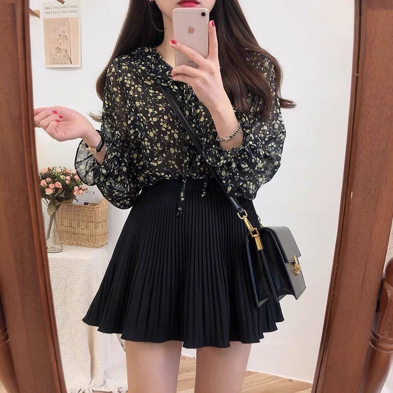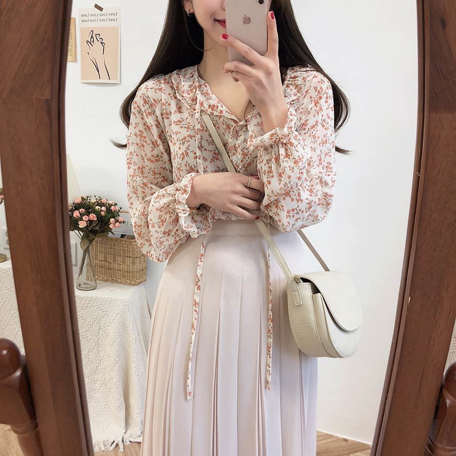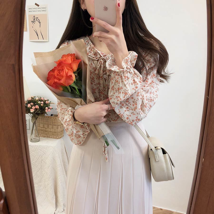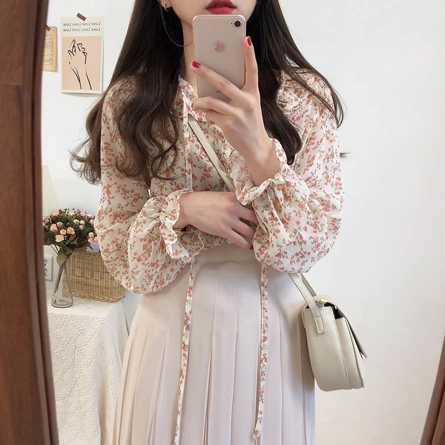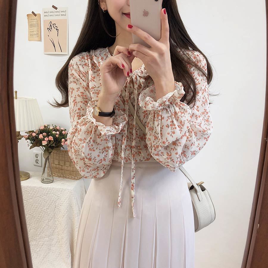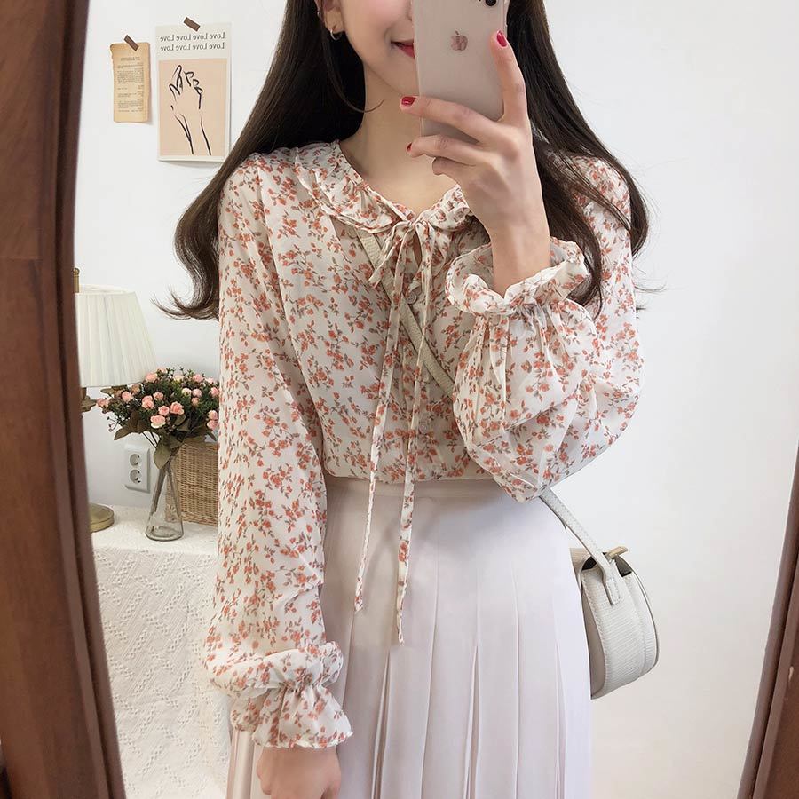 부드러운 스타일 탑 퍼프 슬리브 배꼽 커버 2023 쉬폰 셔츠 웨스턴 스타일 긴 소매 달콤한 꽃 셔츠 여성의 디자인 감각스토어 가기