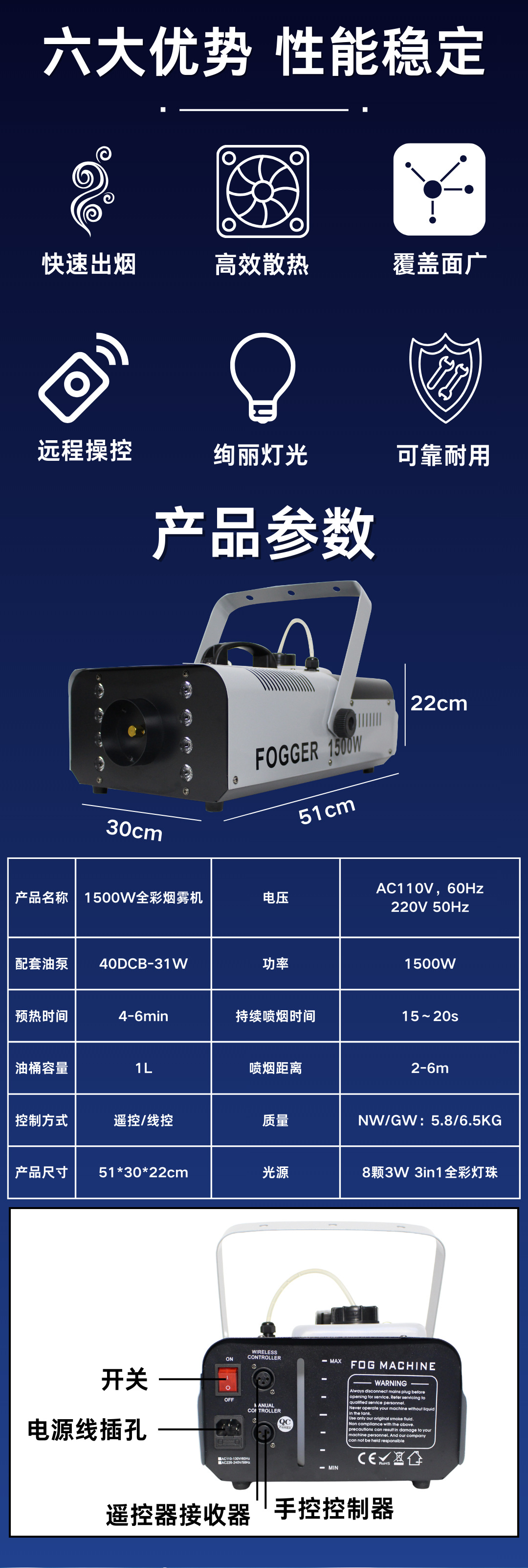 光源资料:8颗3W 3in1全彩灯珠,喷烟嘴两侧各4颗竖排排列