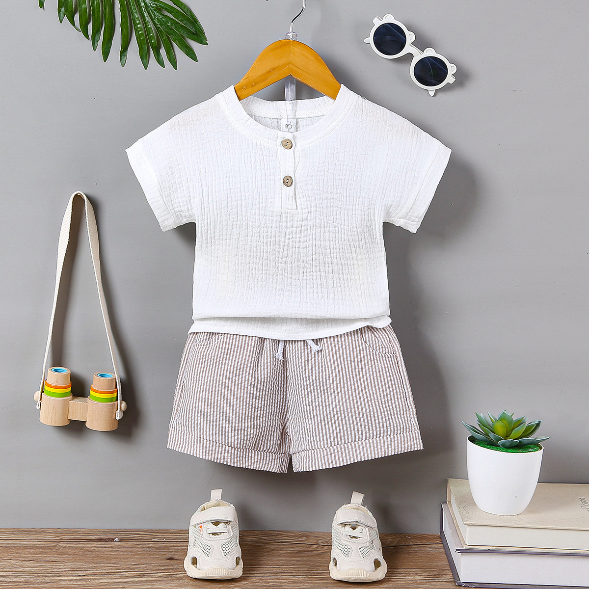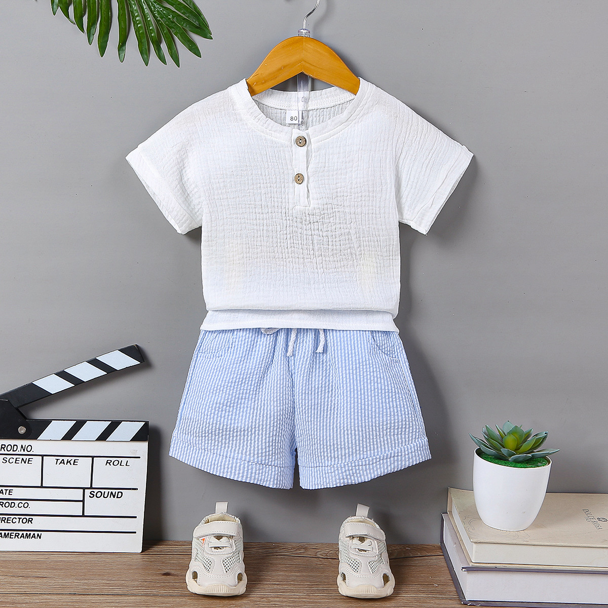 2022 봄 여름 솔리드 컬러 후드 없는 남아 반팔 반바지 세트, 재고 있음, 공장 직판, 캐주얼하고 가벼움