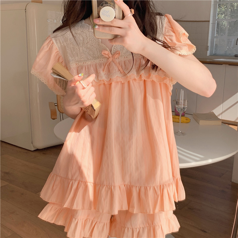 한국 스타일 대외 무역 여성 에서 여름 궁전 스타일 레이스 자카드 면 느슨한 편안한 가정 의류 잠옷 세트 여성스토어 가기
