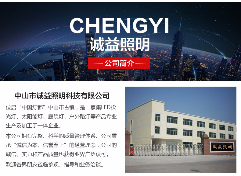 中山市诚益照明科技有限公司是一家集LED投光灯、太阳能灯、庭院灯、户外路灯等产品专业研发及生产销售于一体企业,坐落于中国灯都中山古镇,公司拥有完整、科学的质量管理体系,秉承“诚信为本、信誉至上”的经营理念,公司的诚信、实力和产品质量已获得业界广泛认可。欢迎各界朋友莅临参观、指导和业务洽谈。