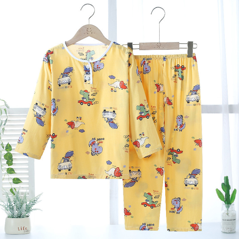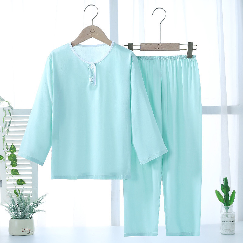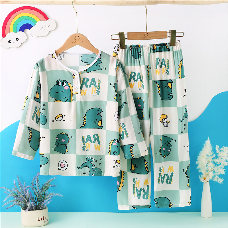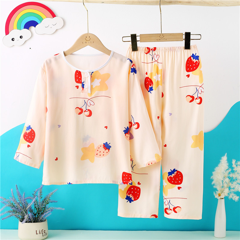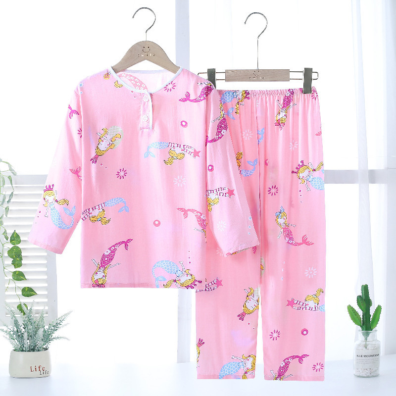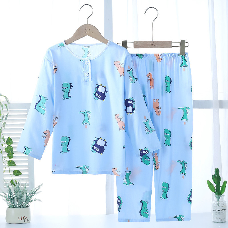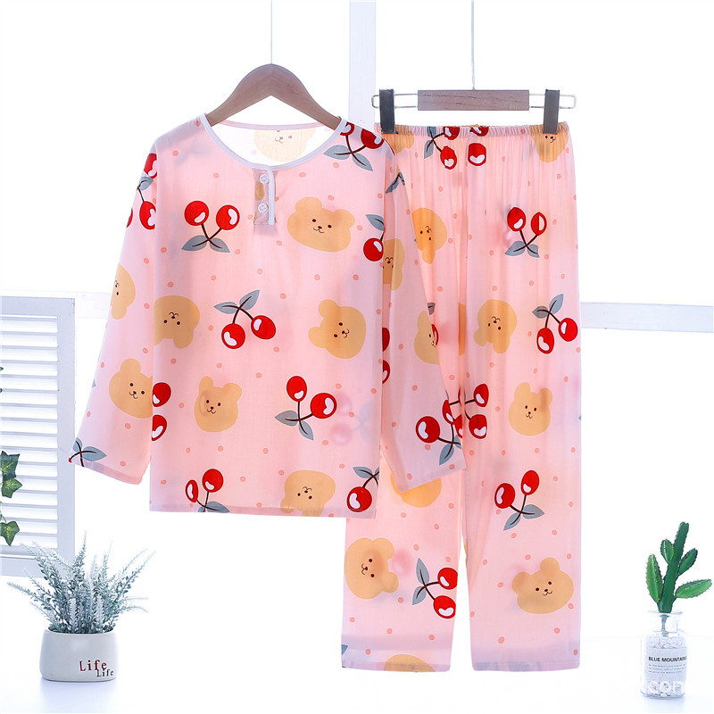 어린이 면 실크 잠옷 여름 얇은 긴 소매 소년과 소녀 아기 에어컨 가정 옷 소녀 면 실크 세트 도매스토어 가기