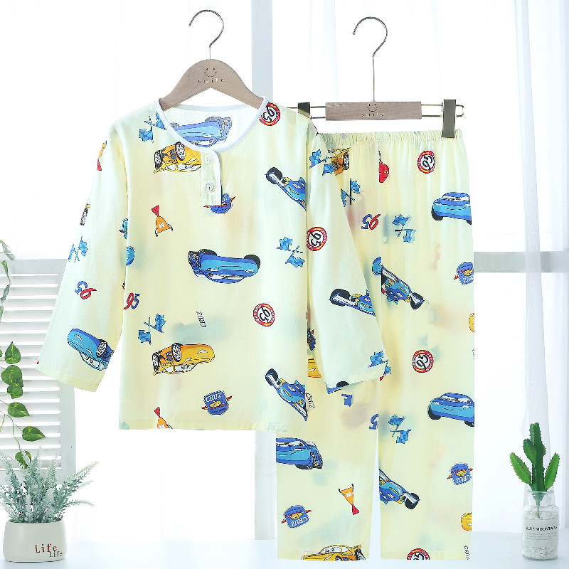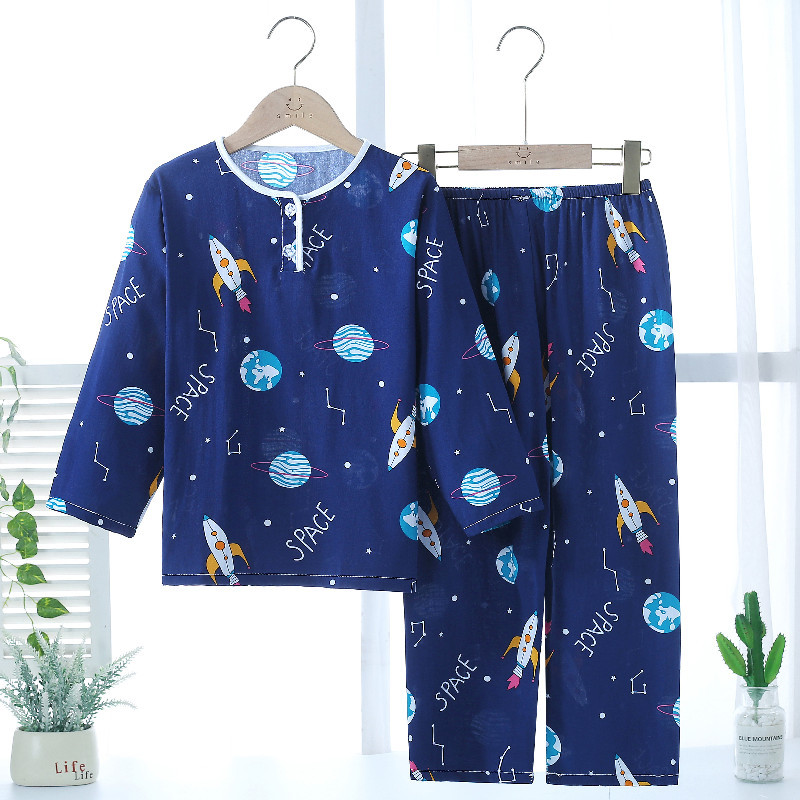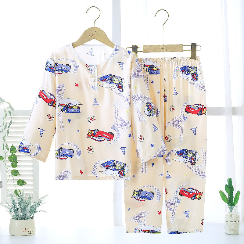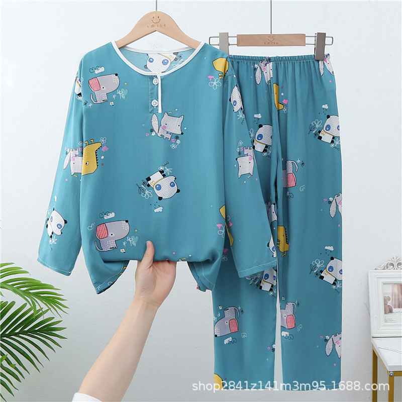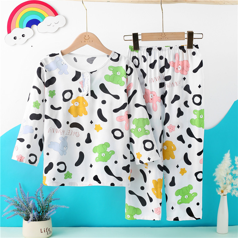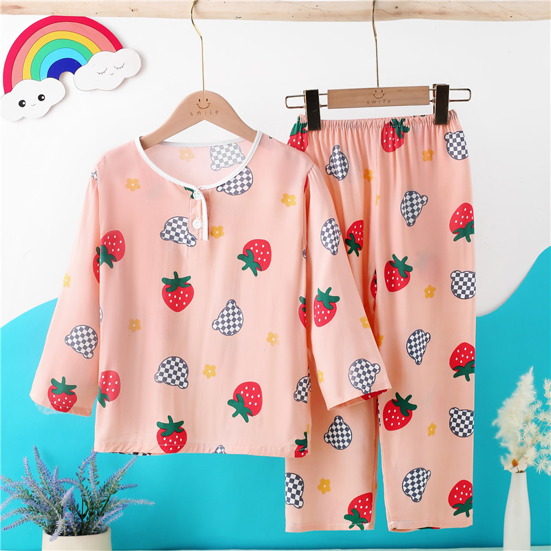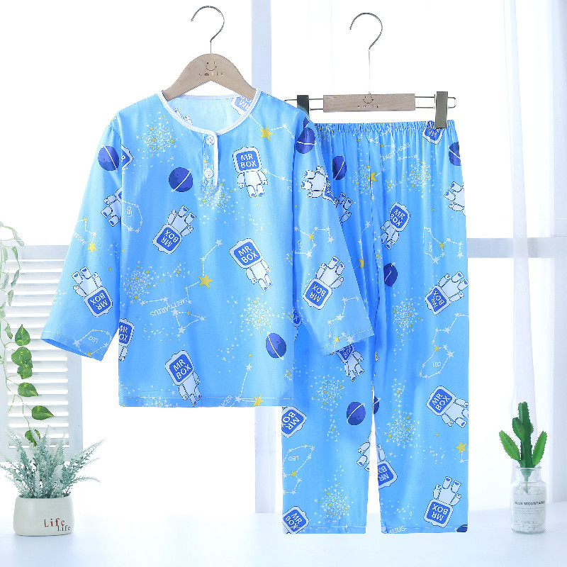 어린이 면 실크 잠옷 여름 얇은 긴 소매 소년과 소녀 아기 에어컨 가정 옷 소녀 면 실크 세트 도매스토어 가기